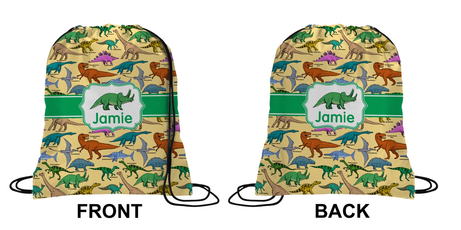 Your custom design will appear on the front and the back of the backpack. You can customize each side individually. The inside of the backpack is white and the drawstrings are black. The back pack is made of 100% polyester fabric.