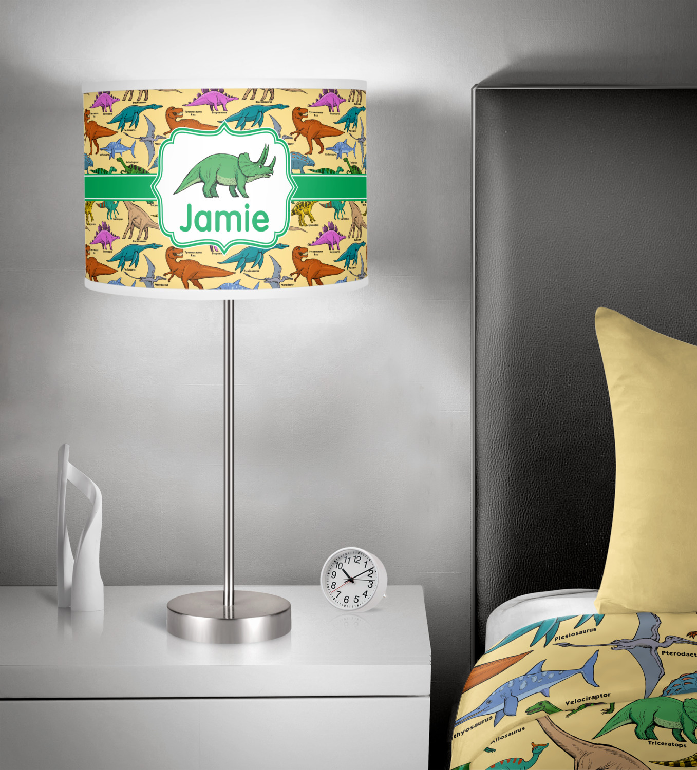 This is made up of 12 different hand drawn dinosaurs (Triceratops, Tyrannosaurus Rex, Velociraptor, Brachiosaurus, Ankylosaurus, Pterodactyl, Stegosaurus, Saurolophus, Plesiosaurus, Allosaurus, Iguanodon and Ichthyosaurus) and each dinosaur has it's type written next to it. We chose a light yellow background with a green ribbon and decorative label; and we chose to use a triceratops and a name inside the label.