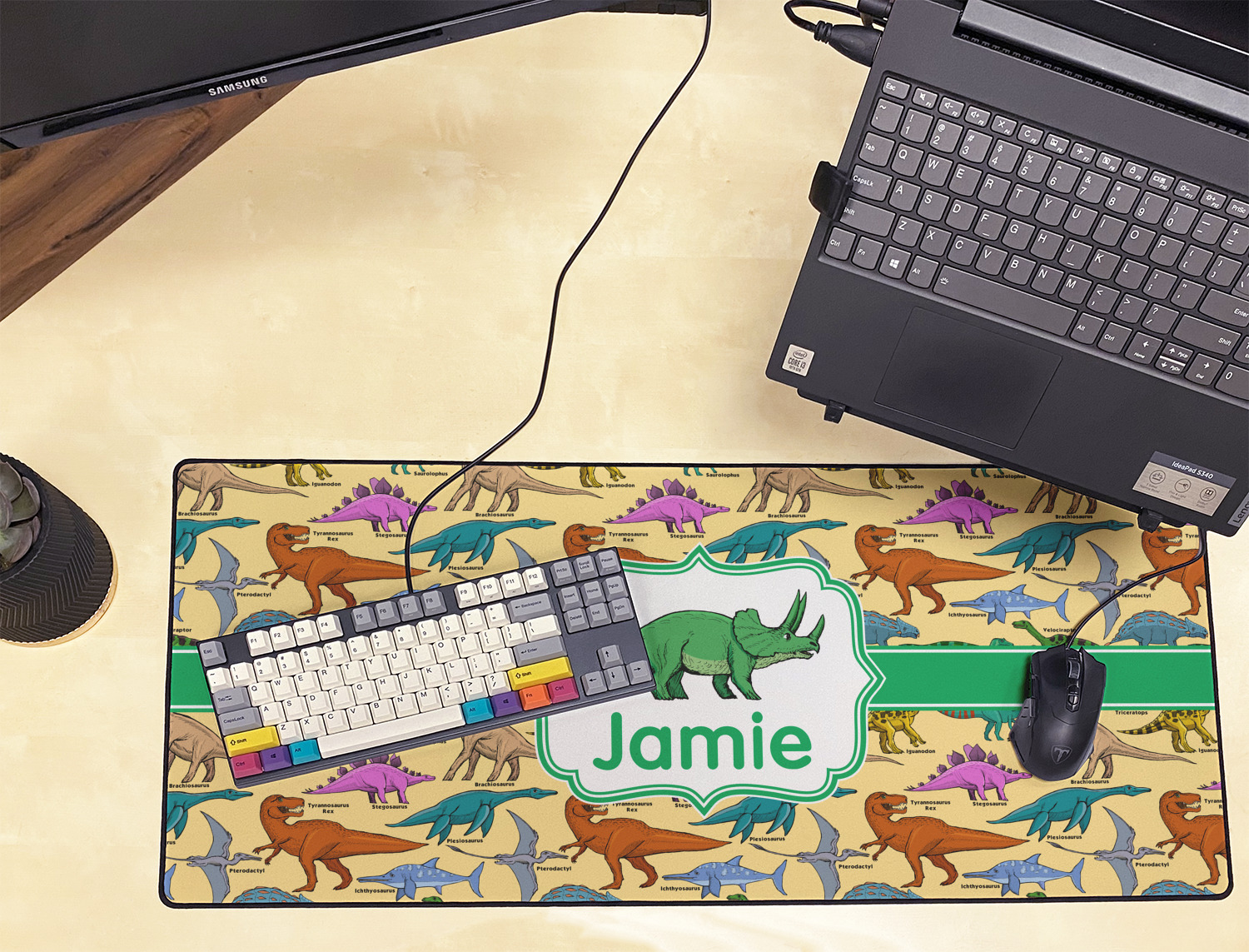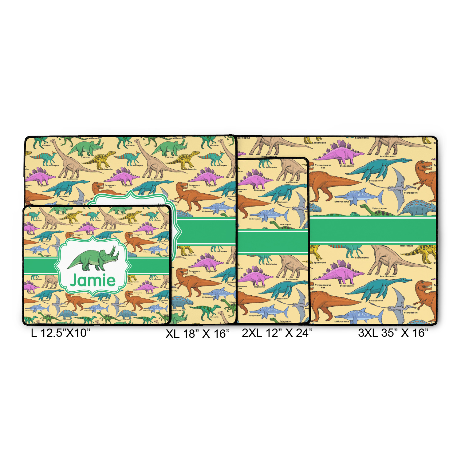 This is made up of 12 different hand drawn dinosaurs (Triceratops, Tyrannosaurus Rex, Velociraptor, Brachiosaurus, Ankylosaurus, Pterodactyl, Stegosaurus, Saurolophus, Plesiosaurus, Allosaurus, Iguanodon and Ichthyosaurus) and each dinosaur has it's type written next to it. We chose a light yellow background with a green ribbon and decorative label; and we chose to use a triceratops and a name inside the label.