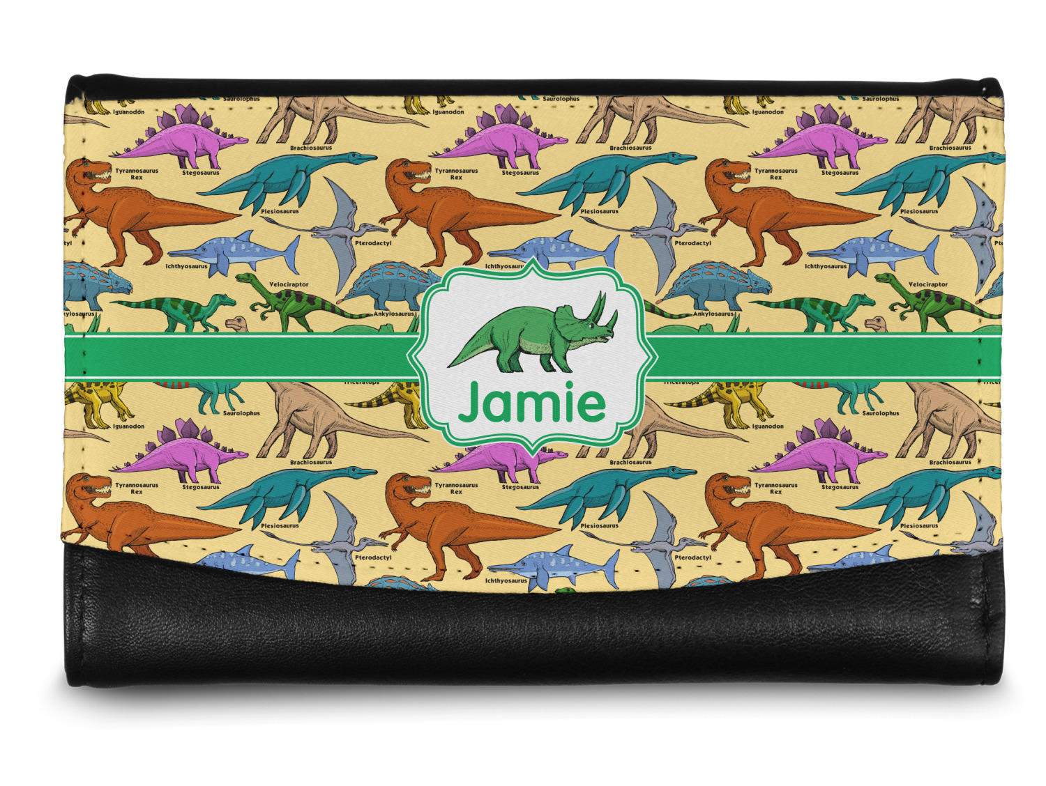 This is made up of 12 different hand drawn dinosaurs (Triceratops, Tyrannosaurus Rex, Velociraptor, Brachiosaurus, Ankylosaurus, Pterodactyl, Stegosaurus, Saurolophus, Plesiosaurus, Allosaurus, Iguanodon and Ichthyosaurus) and each dinosaur has it's type written next to it. We chose a light yellow background with a green ribbon and decorative label; and we chose to use a triceratops and a name inside the label.