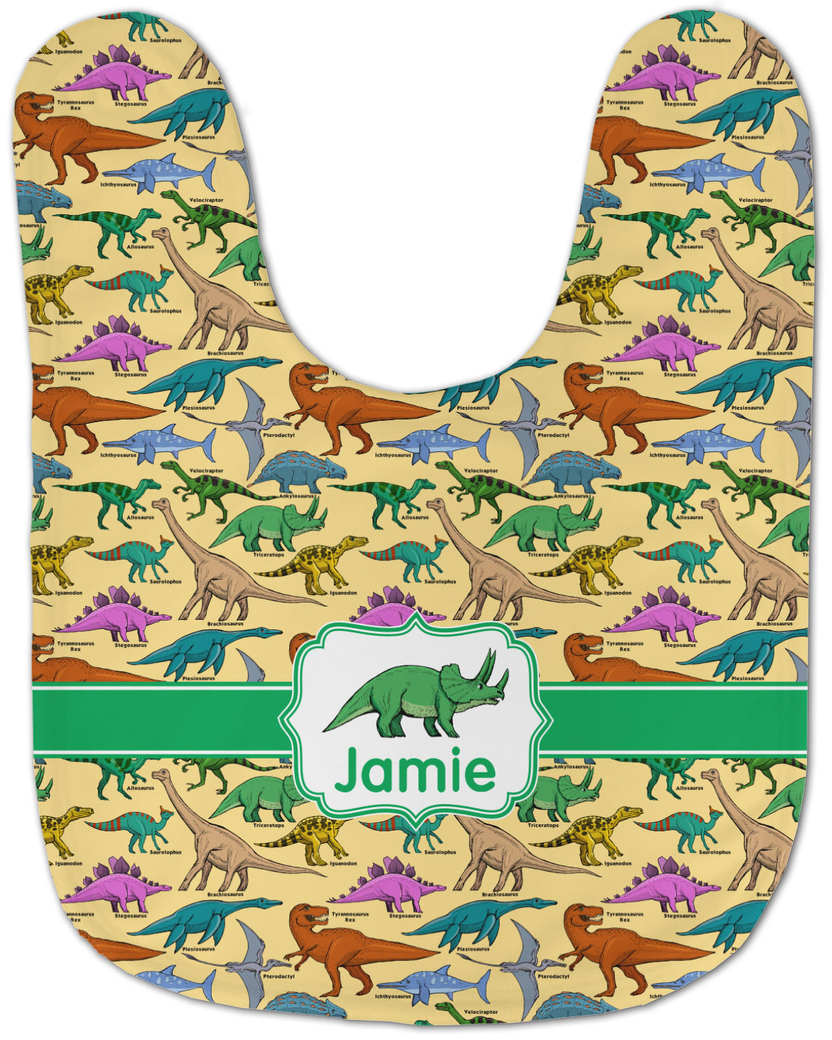 This is made up of 12 different hand drawn dinosaurs (Triceratops, Tyrannosaurus Rex, Velociraptor, Brachiosaurus, Ankylosaurus, Pterodactyl, Stegosaurus, Saurolophus, Plesiosaurus, Allosaurus, Iguanodon and Ichthyosaurus) and each dinosaur has it's type written next to it. We chose a light yellow background with a green ribbon and decorative label; and we chose to use a triceratops and a name inside the label.