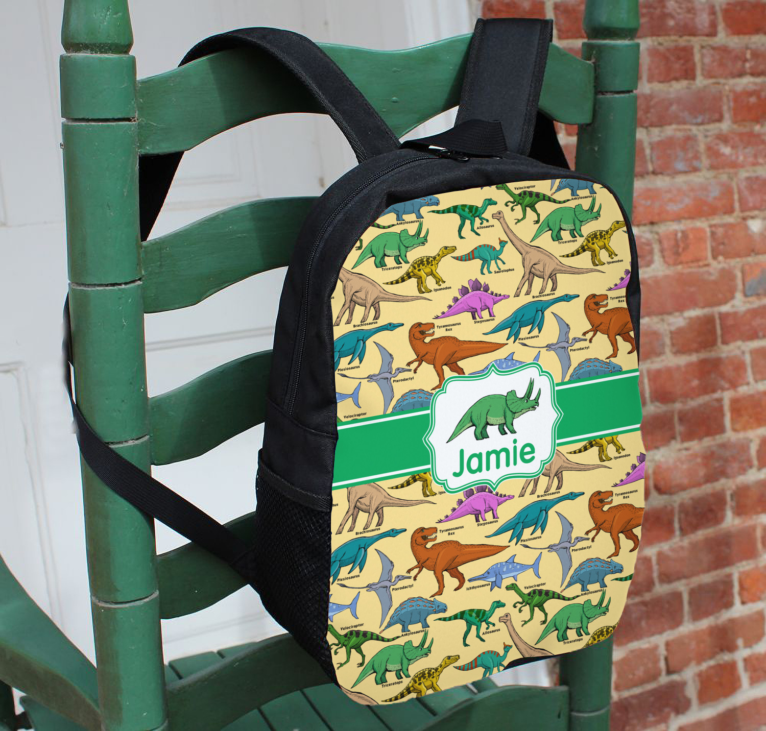 These small backpacks are made of a durable black canvas material with your personalization right on the front. The two shoulder straps are padded and easily adjustable. The bag itself measures at about 11" W x 15" H x 5" D. It's the perfect size for elementary aged kids or adults who want a smaller backpack. On the top of the bag you will find a handle to hang or carry your backpack by as well as a large zipper closure to keep all of your belongings safe inside. On each side of your backpack is a mesh pocket for a small item or water bottle. Inside your backpack you will find a spacious area with a small zipper pocket and a padded laptop slot that will fit up to a 13" laptop (13" being very snug). This is the perfect bag for any student that needs a couple books and their laptop with them at all times. It also works great as a carry on for traveling!