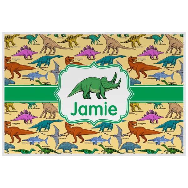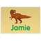 This is made up of 12 different hand drawn dinosaurs (Triceratops, Tyrannosaurus Rex, Velociraptor, Brachiosaurus, Ankylosaurus, Pterodactyl, Stegosaurus, Saurolophus, Plesiosaurus, Allosaurus, Iguanodon and Ichthyosaurus) and each dinosaur has it's type written next to it. We chose a light yellow background with a green ribbon and decorative label; and we chose to use a triceratops and a name inside the label.