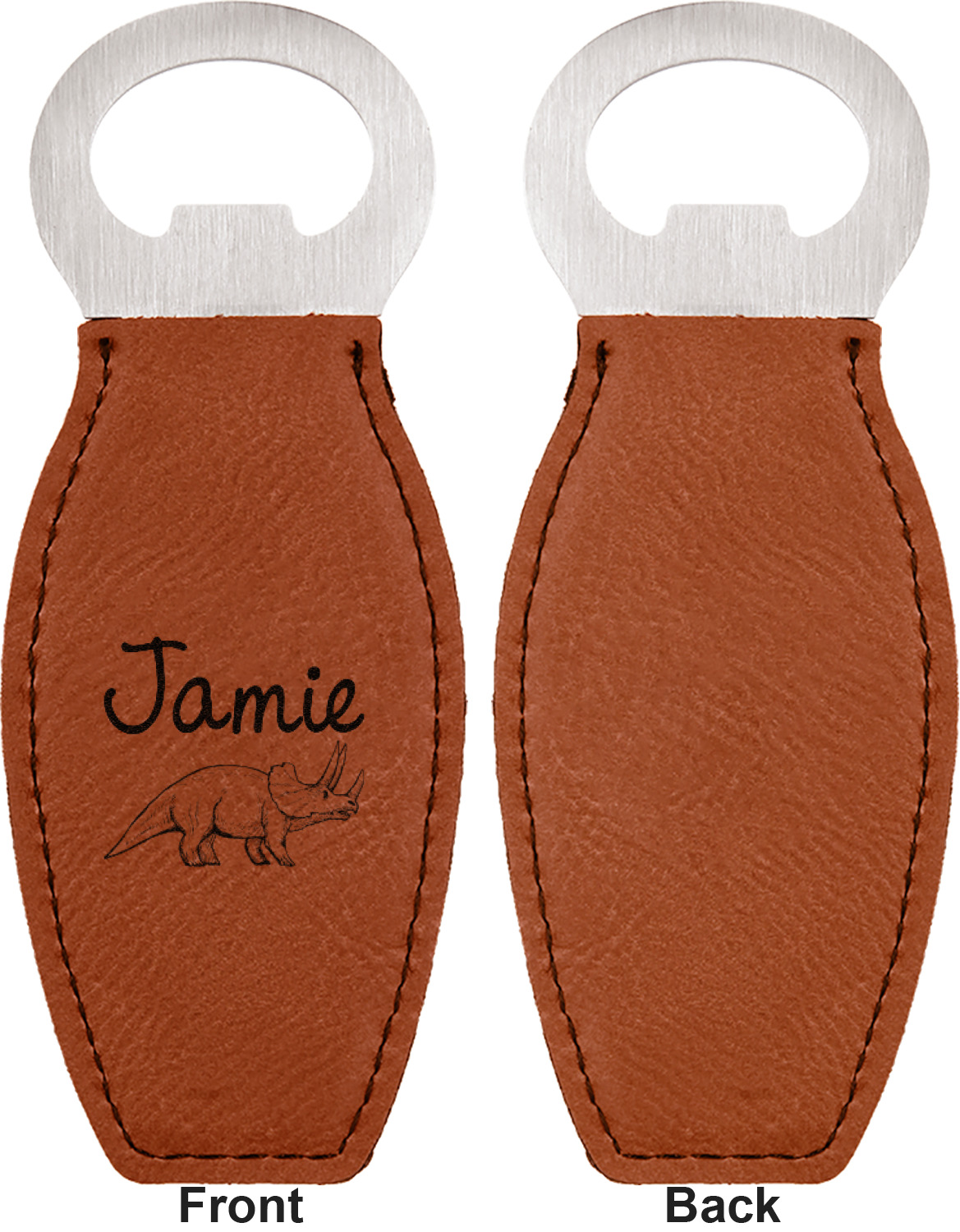 Built from stainless steel, these custom bottle openers are wrapped in a cognac-colored leatherette. Sharp, black stitching lines the edges for extra durability and a finished touch. Your personalization is laser-engraved onto the surface of this leatherette, leaving behind a crisp, black coloration. At 4.6 by 1.8 inches, this beer bottle opener gives you much of leverage when trying to open a stubborn bottle. On the opposite end of the opener, you'll find a magnet that you can use to display your new, unique bottle opener!