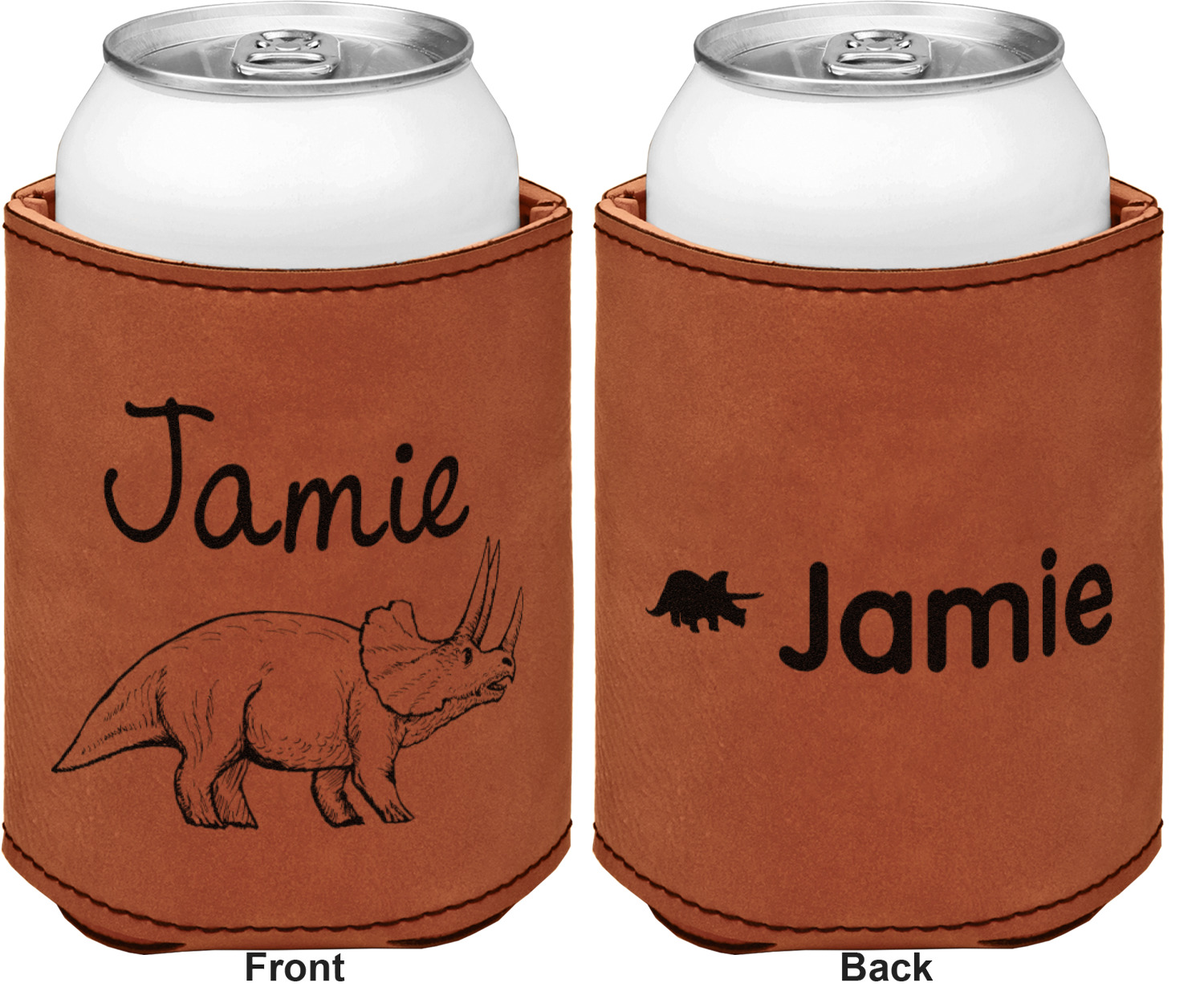 This can sleeve is made from a cognac-brown leatherette and stitched with a sturdy, black thread. A slim padding lines the inside of your can sleeve to allow for a better fit once your drink is inserted. The sleeve itself measures at 4 by 4.5 inches, allowing this custom can sleeve to accommodate most canned drinks. Your personalized design can be engraved on the front and back, or solely the front. When laser-engraved, your design appears as a black coloration which contrasts the leatherette nicely.