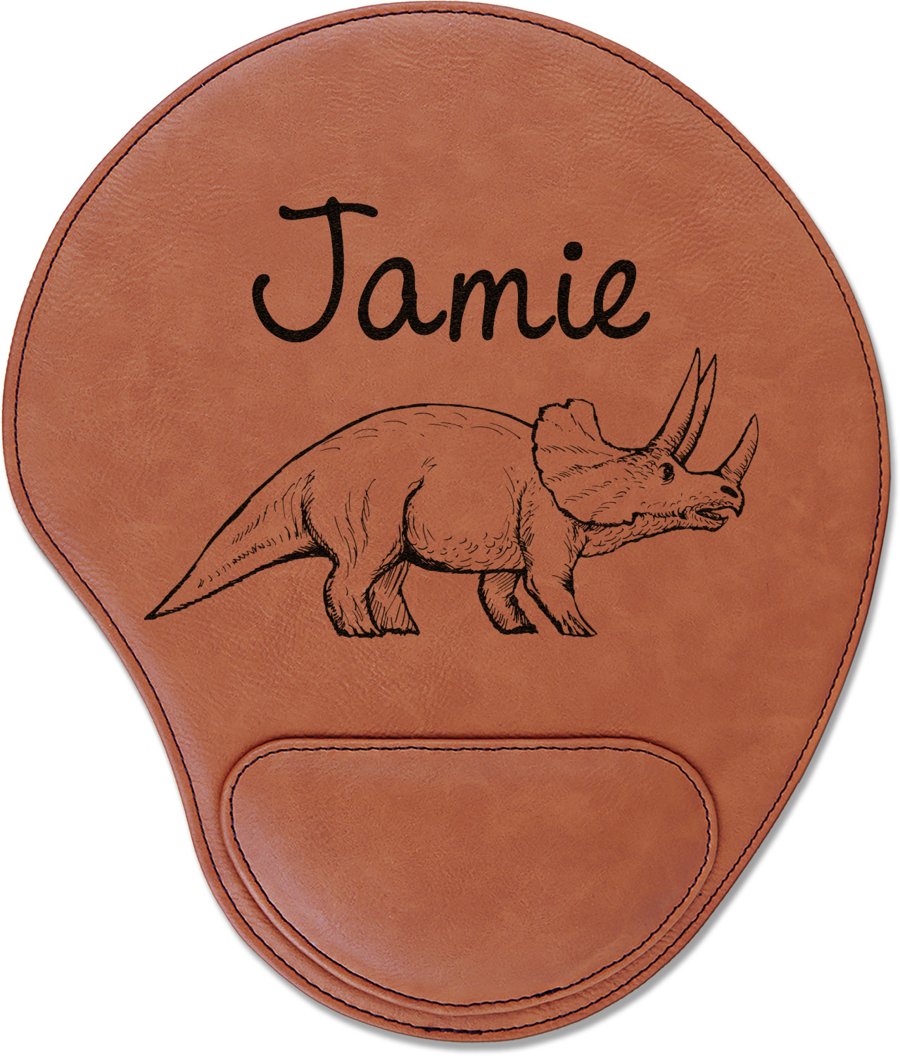 In a rounded shape, this mouse pad is made of a luxurious, cognac-colored leatherette. The nature of this material allows your mouse to glide smoothly across its surface. Strong stitching lines the edges to guarantee stability and strength. As added support for tired wrists, your personalized mouse pad features a supportive wrist rest at its bottom. This model measures at 10.25" x 9", while its wrist pad is approximately 5" x 2.75", with a thickness of 0.75". Your personalized design is laser engraved into the front face of this mouse pad.