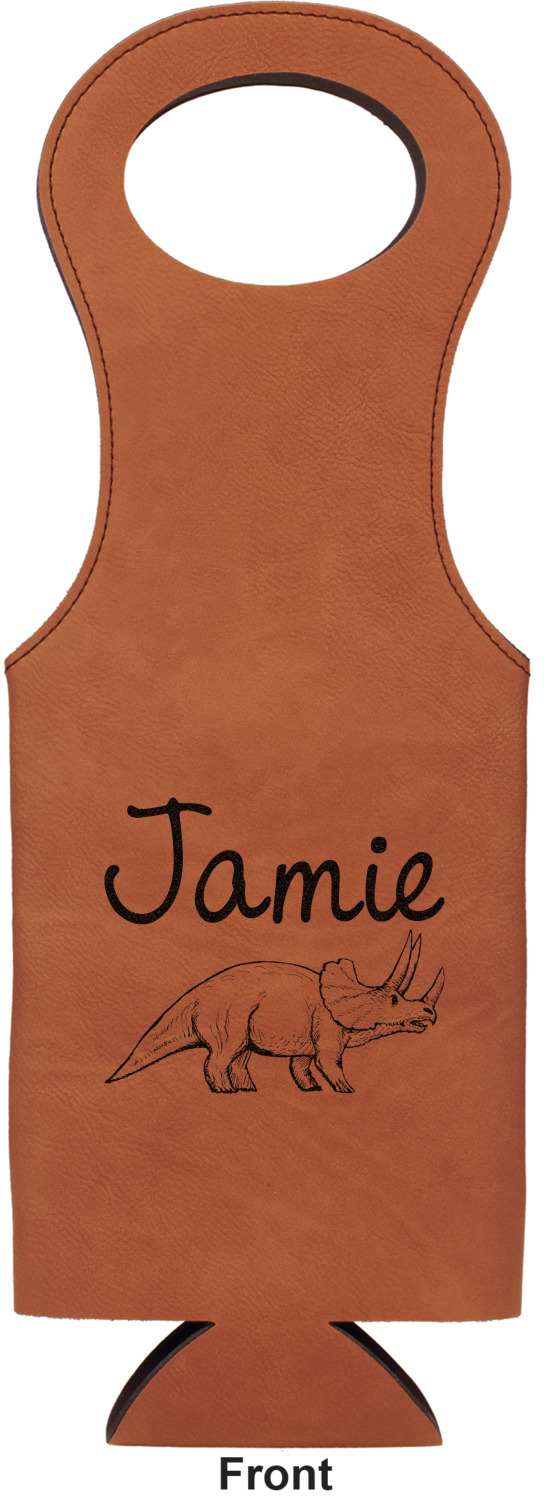 This wine carrier is made from a stunning leatherette, in a cognac-brown color. Strong, black stitching lines the sides of your wine bottle bag and provides extra durability. The interior is lined with a padded, black material to allow for a snug fit once your bottle is placed inside. At the top of this wine gift bag, you'll find two oval shaped handles that elegantly complements the rest of the bag's style. We provide you with the option of laser-engraving the front, or the front and back of your new personalized wine bag!