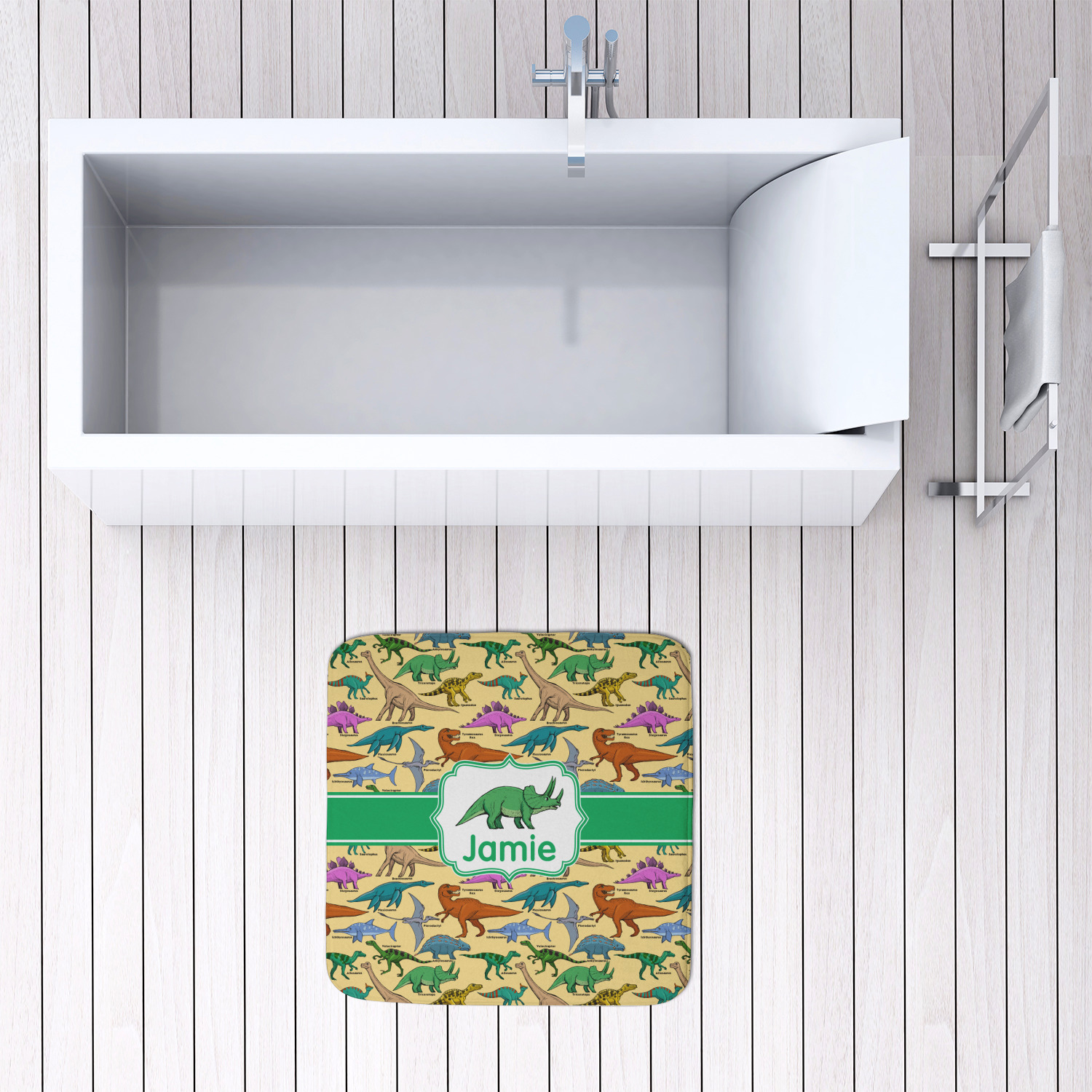 We offer this custom bath mat in four different sizes, so that you can choose the proper size for your bathroom and shower space. We suggest measuring the area before so that you can make an informed purchase. The four sizes are as follows: 24 by 17 inches, 34 by 21 inches, 48 by 36 inches, and 48 by 48 inches.