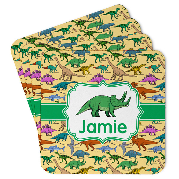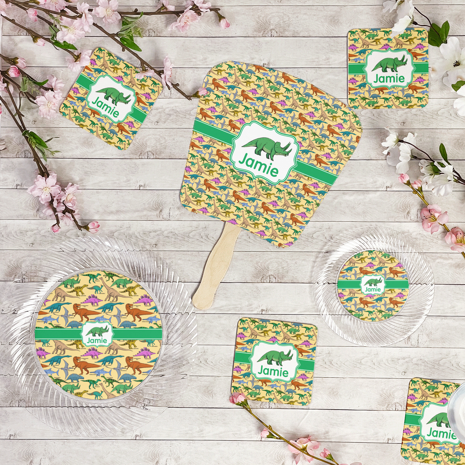 This is made up of 12 different hand drawn dinosaurs (Triceratops, Tyrannosaurus Rex, Velociraptor, Brachiosaurus, Ankylosaurus, Pterodactyl, Stegosaurus, Saurolophus, Plesiosaurus, Allosaurus, Iguanodon and Ichthyosaurus) and each dinosaur has it's type written next to it. We chose a light yellow background with a green ribbon and decorative label; and we chose to use a triceratops and a name inside the label.