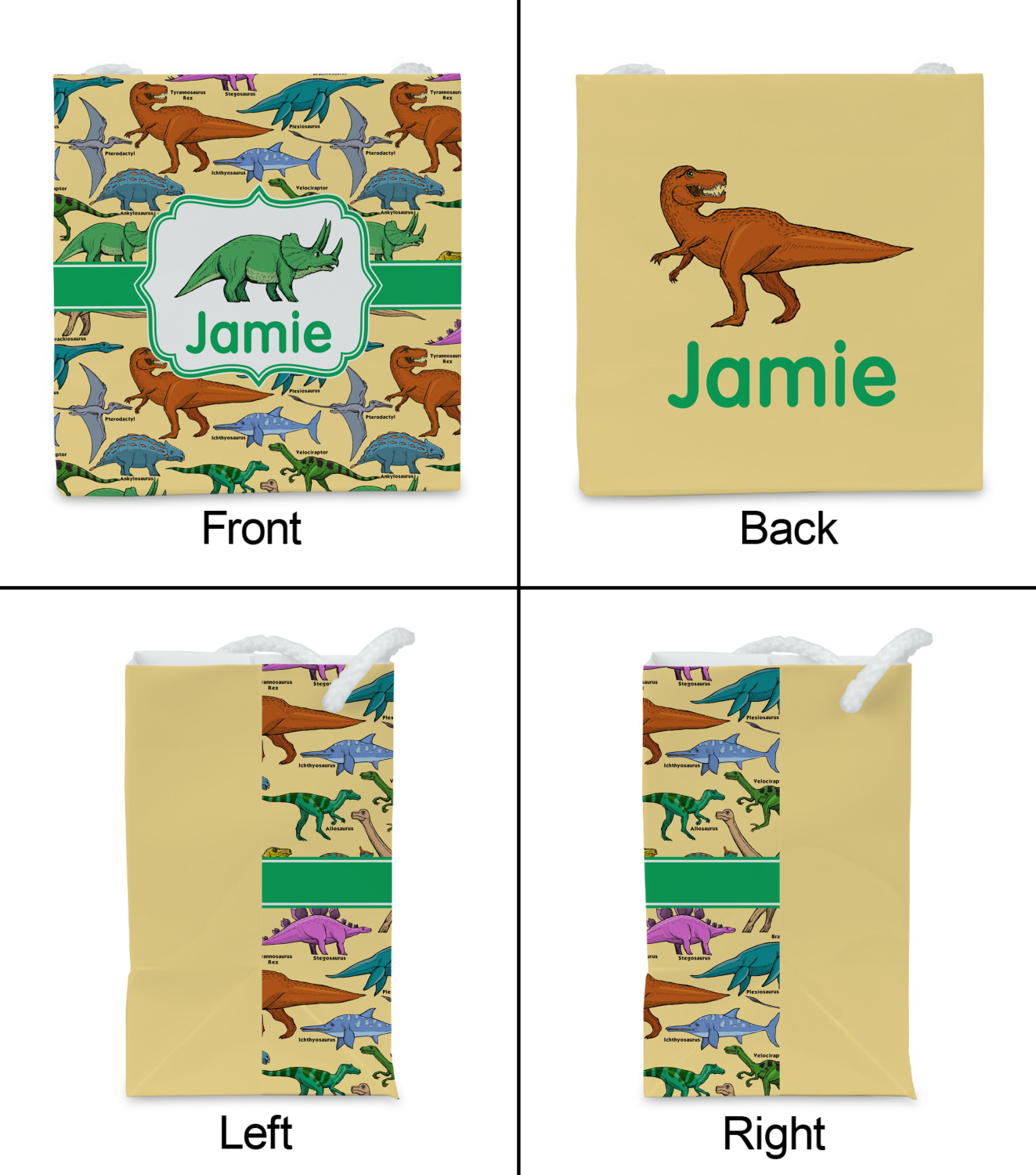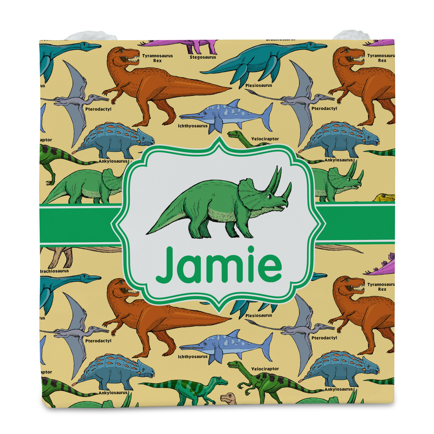 This is made up of 12 different hand drawn dinosaurs (Triceratops, Tyrannosaurus Rex, Velociraptor, Brachiosaurus, Ankylosaurus, Pterodactyl, Stegosaurus, Saurolophus, Plesiosaurus, Allosaurus, Iguanodon and Ichthyosaurus) and each dinosaur has it's type written next to it. We chose a light yellow background with a green ribbon and decorative label; and we chose to use a triceratops and a name inside the label.