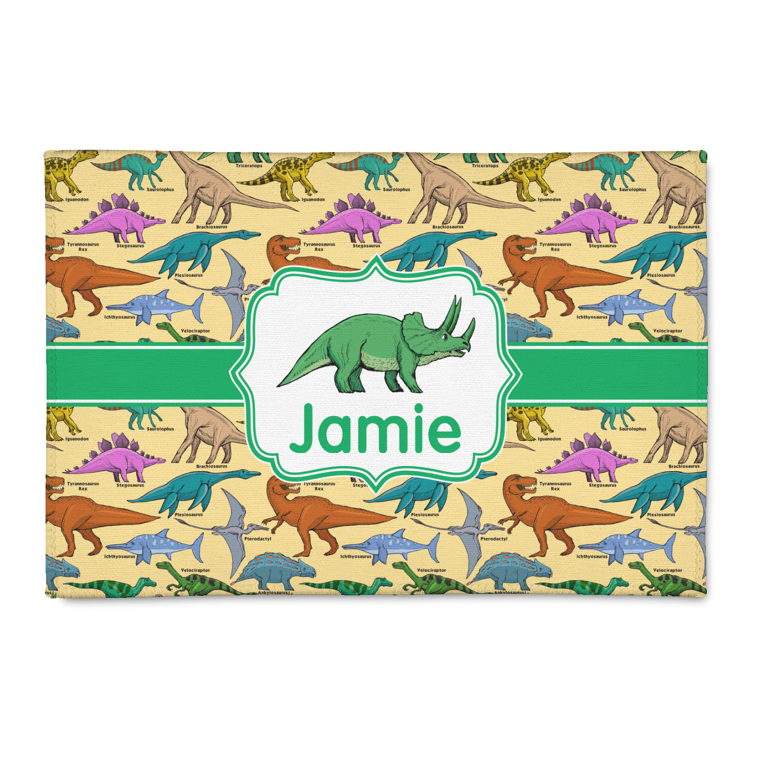 This is made up of 12 different hand drawn dinosaurs (Triceratops, Tyrannosaurus Rex, Velociraptor, Brachiosaurus, Ankylosaurus, Pterodactyl, Stegosaurus, Saurolophus, Plesiosaurus, Allosaurus, Iguanodon and Ichthyosaurus) and each dinosaur has it's type written next to it. We chose a light yellow background with a green ribbon and decorative label; and we chose to use a triceratops and a name inside the label.
