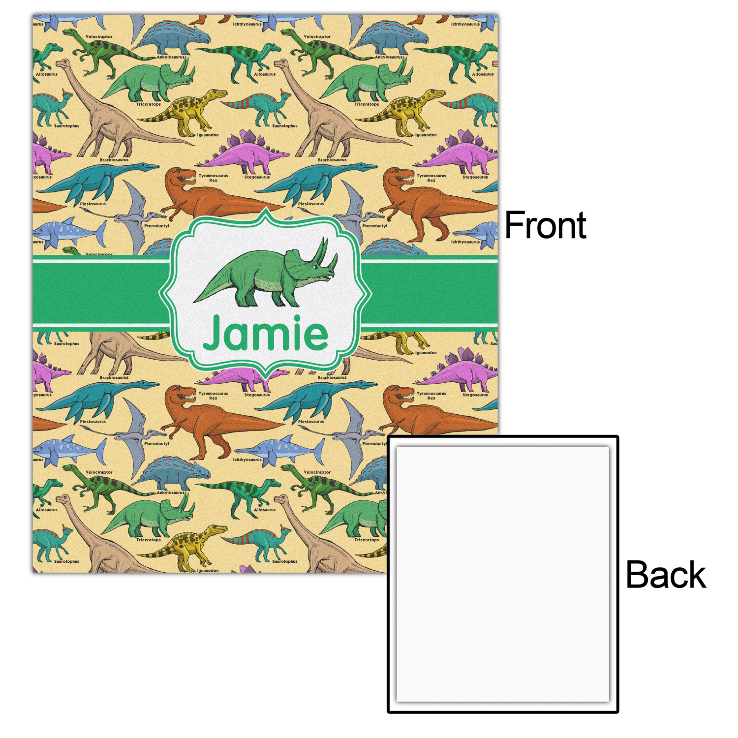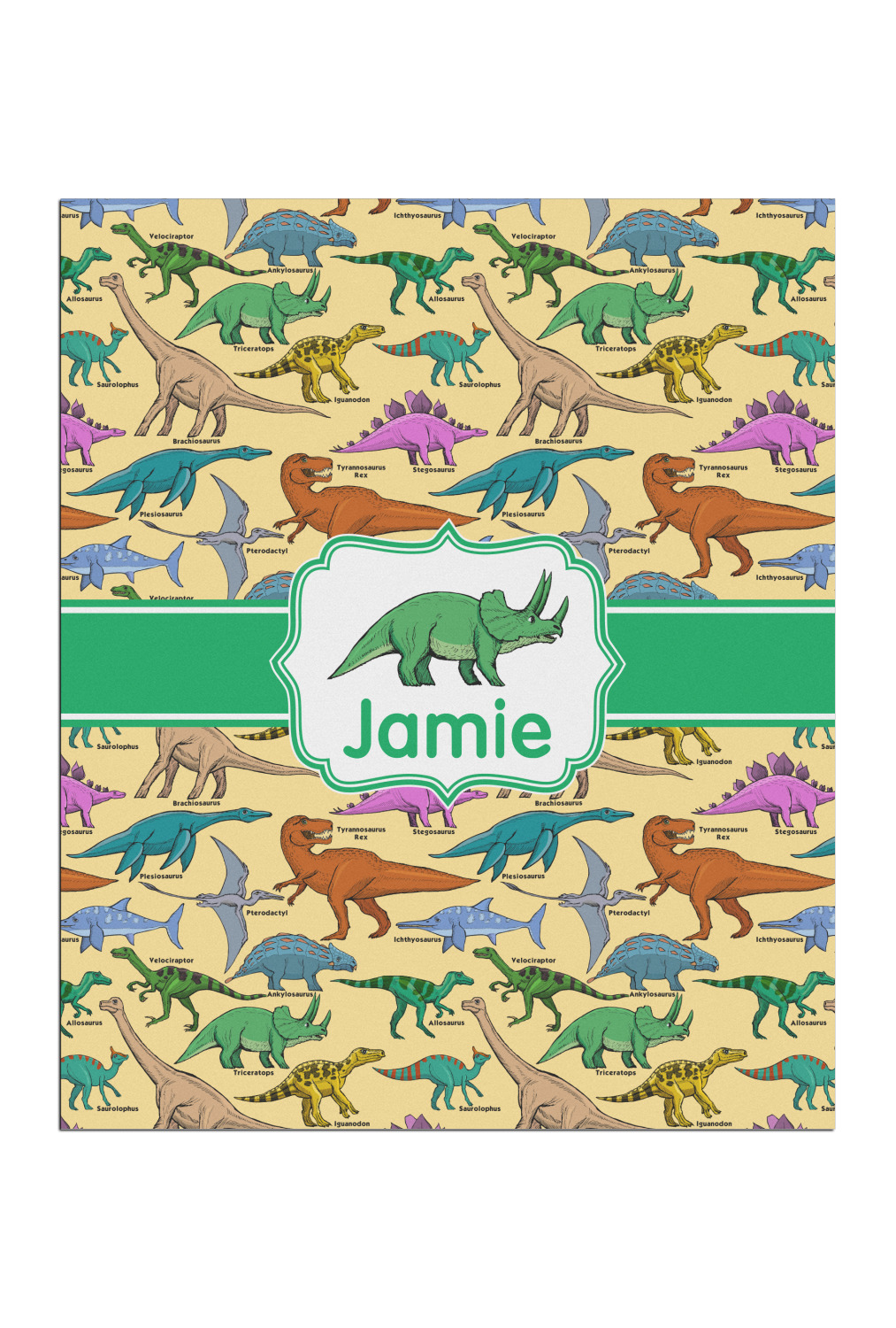 This is made up of 12 different hand drawn dinosaurs (Triceratops, Tyrannosaurus Rex, Velociraptor, Brachiosaurus, Ankylosaurus, Pterodactyl, Stegosaurus, Saurolophus, Plesiosaurus, Allosaurus, Iguanodon and Ichthyosaurus) and each dinosaur has it's type written next to it. We chose a light yellow background with a green ribbon and decorative label; and we chose to use a triceratops and a name inside the label.