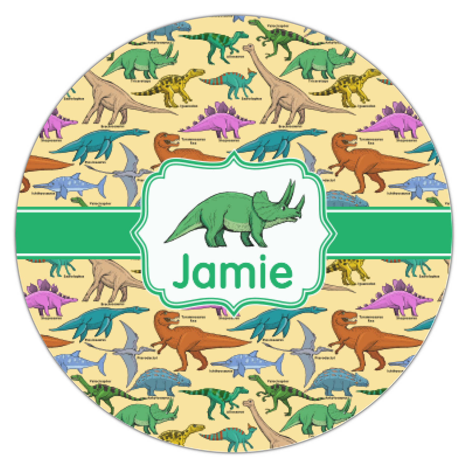 This is made up of 12 different hand drawn dinosaurs (Triceratops, Tyrannosaurus Rex, Velociraptor, Brachiosaurus, Ankylosaurus, Pterodactyl, Stegosaurus, Saurolophus, Plesiosaurus, Allosaurus, Iguanodon and Ichthyosaurus) and each dinosaur has it's type written next to it. We chose a light yellow background with a green ribbon and decorative label; and we chose to use a triceratops and a name inside the label.