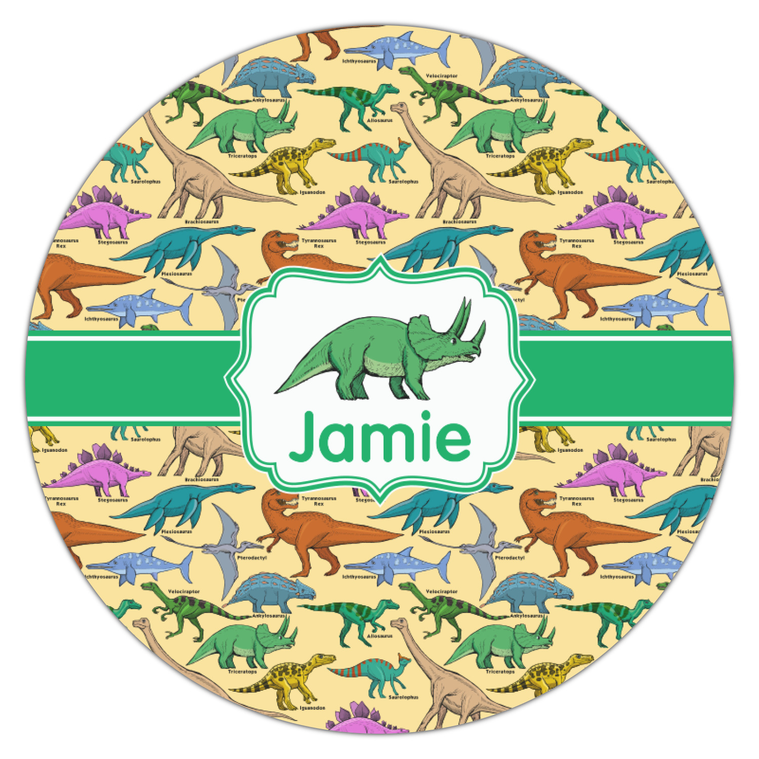 This is made up of 12 different hand drawn dinosaurs (Triceratops, Tyrannosaurus Rex, Velociraptor, Brachiosaurus, Ankylosaurus, Pterodactyl, Stegosaurus, Saurolophus, Plesiosaurus, Allosaurus, Iguanodon and Ichthyosaurus) and each dinosaur has it's type written next to it. We chose a light yellow background with a green ribbon and decorative label; and we chose to use a triceratops and a name inside the label.