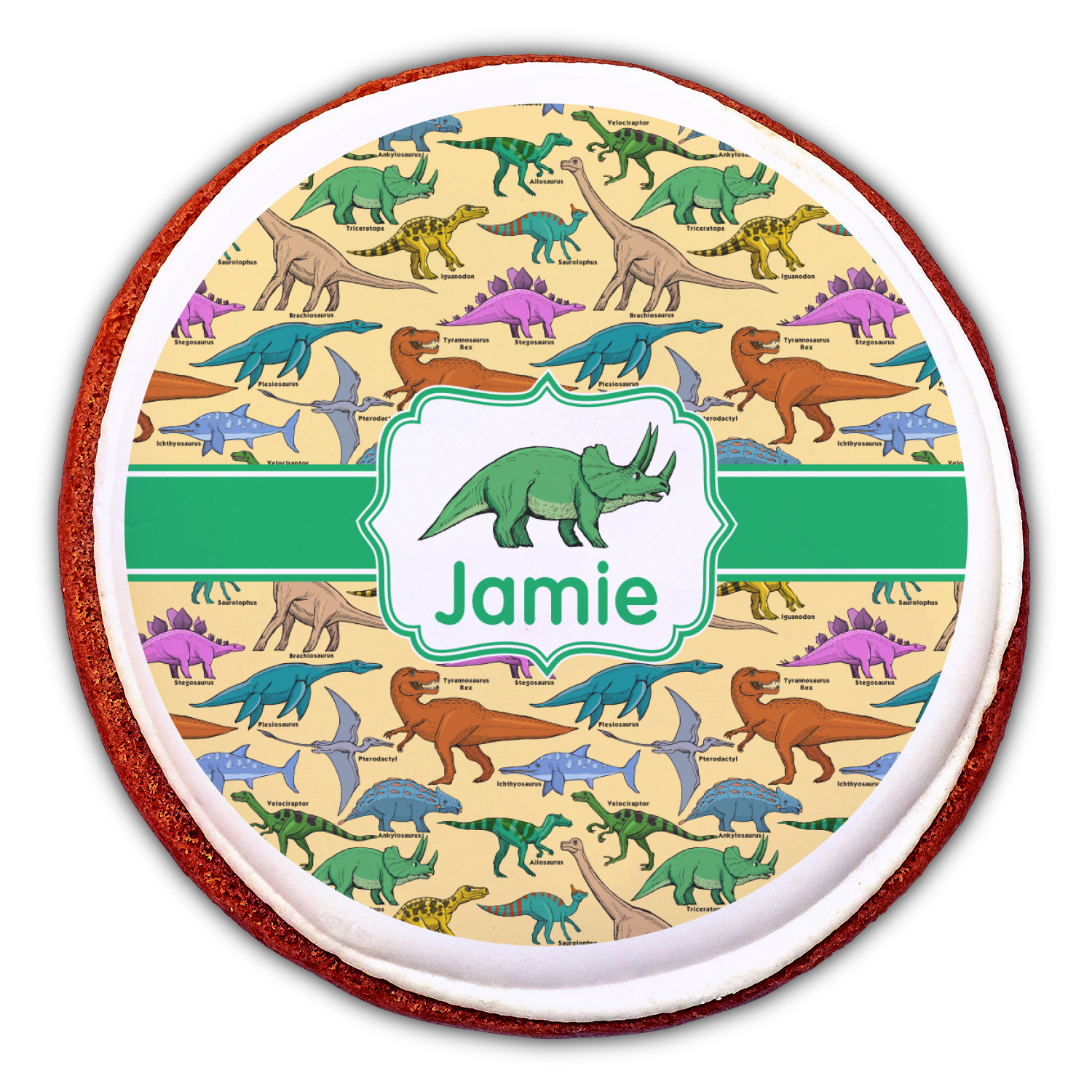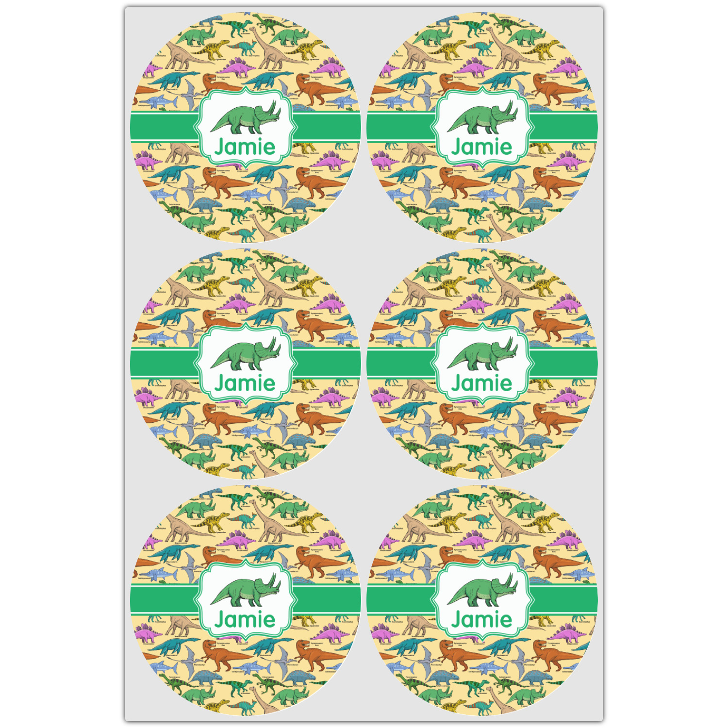 This is made up of 12 different hand drawn dinosaurs (Triceratops, Tyrannosaurus Rex, Velociraptor, Brachiosaurus, Ankylosaurus, Pterodactyl, Stegosaurus, Saurolophus, Plesiosaurus, Allosaurus, Iguanodon and Ichthyosaurus) and each dinosaur has it's type written next to it. We chose a light yellow background with a green ribbon and decorative label; and we chose to use a triceratops and a name inside the label.