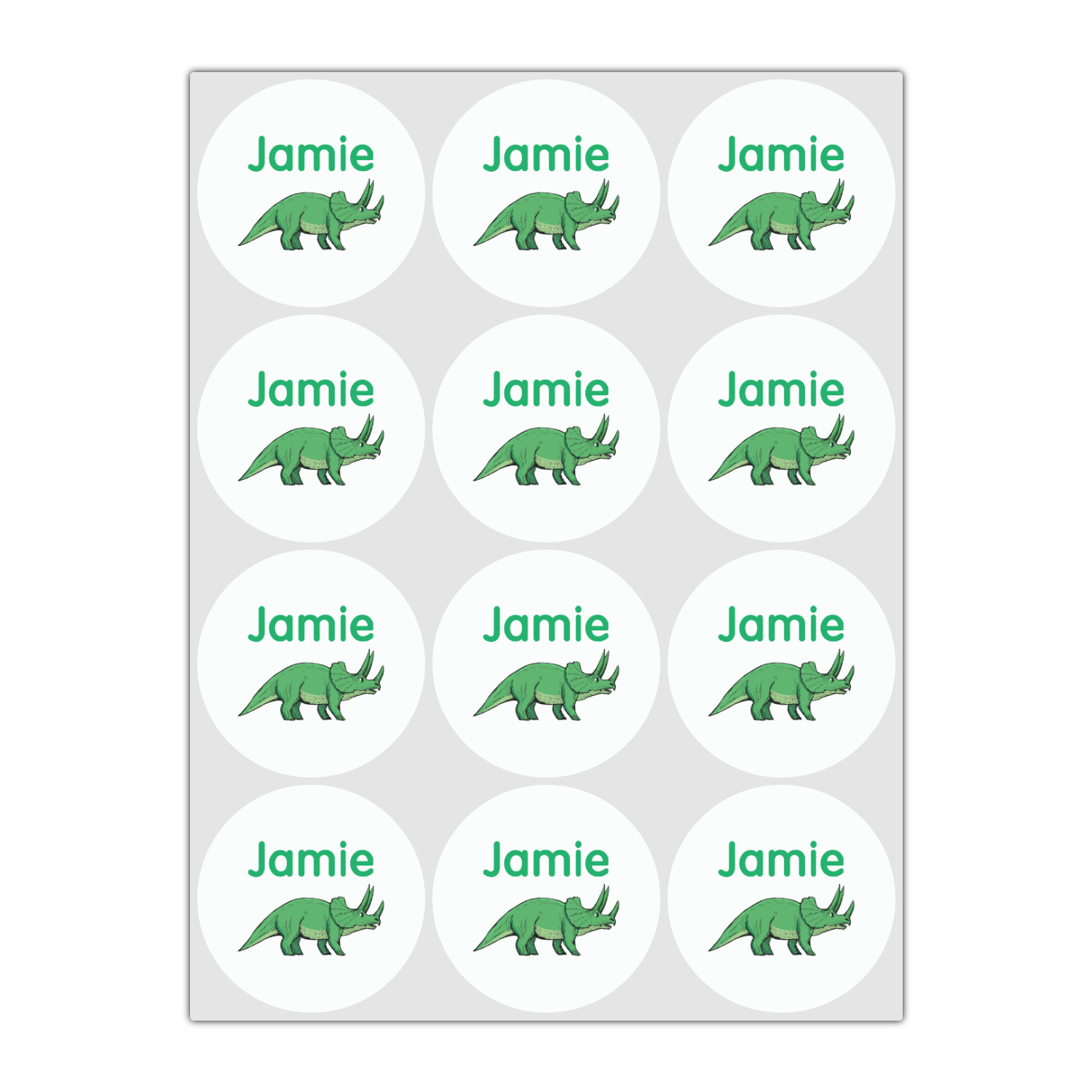 This is made up of 12 different hand drawn dinosaurs (Triceratops, Tyrannosaurus Rex, Velociraptor, Brachiosaurus, Ankylosaurus, Pterodactyl, Stegosaurus, Saurolophus, Plesiosaurus, Allosaurus, Iguanodon and Ichthyosaurus) and each dinosaur has it's type written next to it. We chose a light yellow background with a green ribbon and decorative label; and we chose to use a triceratops and a name inside the label.