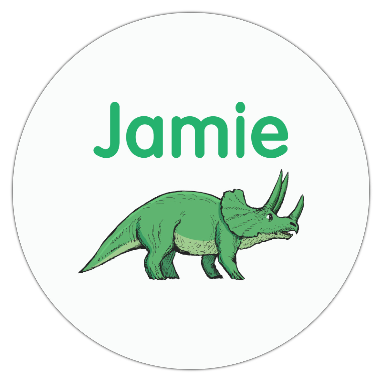 This is made up of 12 different hand drawn dinosaurs (Triceratops, Tyrannosaurus Rex, Velociraptor, Brachiosaurus, Ankylosaurus, Pterodactyl, Stegosaurus, Saurolophus, Plesiosaurus, Allosaurus, Iguanodon and Ichthyosaurus) and each dinosaur has it's type written next to it. We chose a light yellow background with a green ribbon and decorative label; and we chose to use a triceratops and a name inside the label.