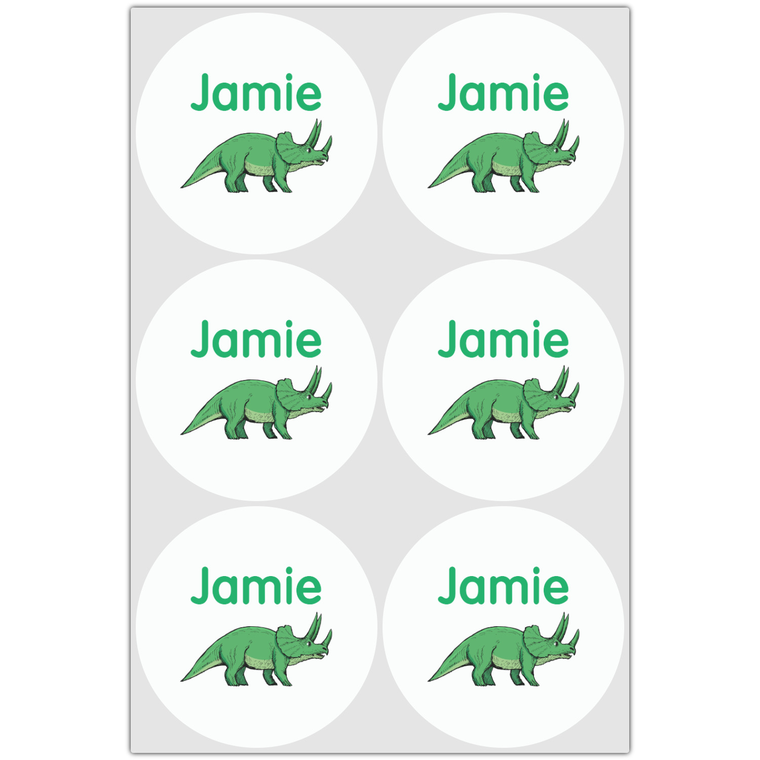 This is made up of 12 different hand drawn dinosaurs (Triceratops, Tyrannosaurus Rex, Velociraptor, Brachiosaurus, Ankylosaurus, Pterodactyl, Stegosaurus, Saurolophus, Plesiosaurus, Allosaurus, Iguanodon and Ichthyosaurus) and each dinosaur has it's type written next to it. We chose a light yellow background with a green ribbon and decorative label; and we chose to use a triceratops and a name inside the label.