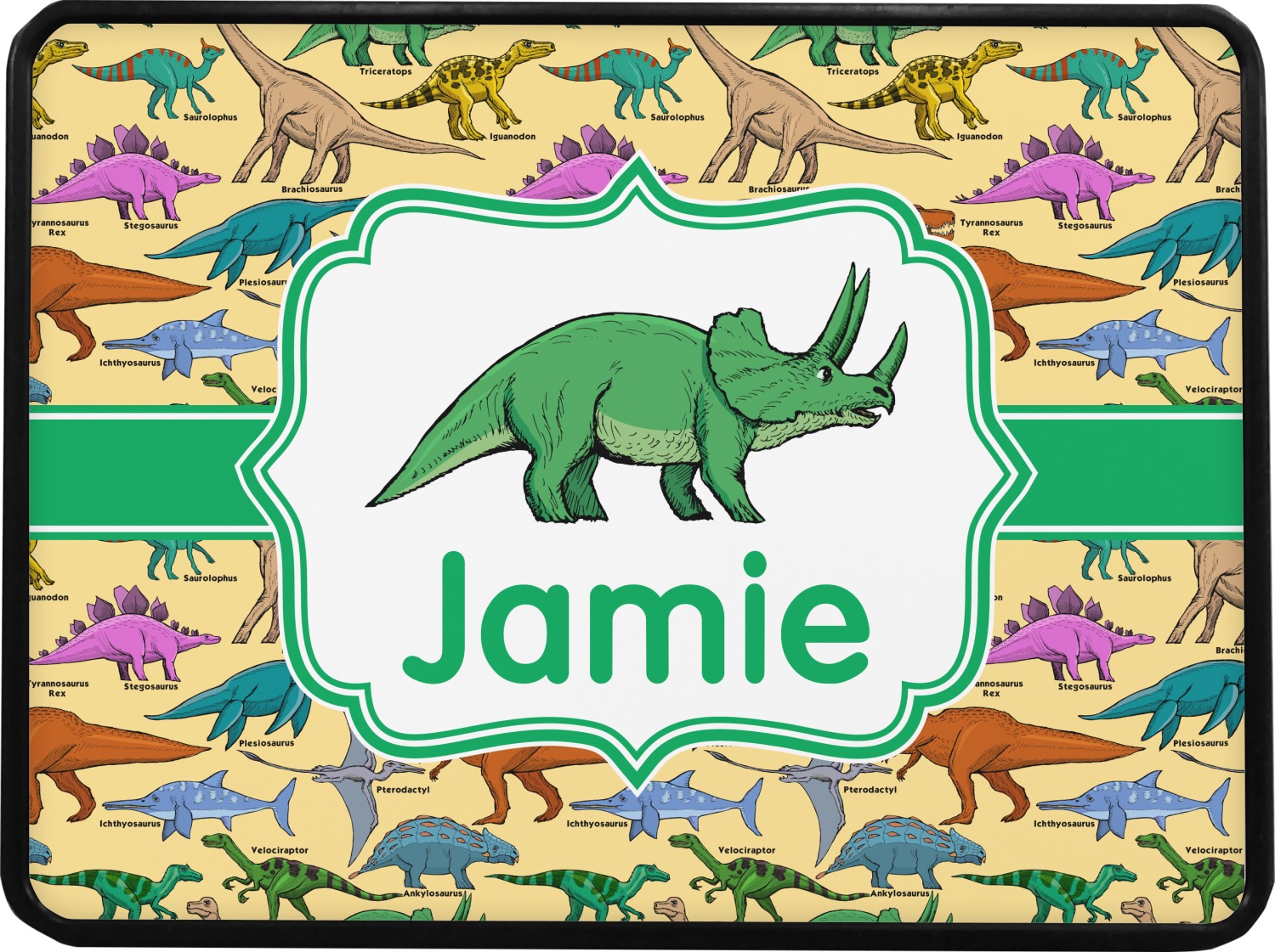 This is made up of 12 different hand drawn dinosaurs (Triceratops, Tyrannosaurus Rex, Velociraptor, Brachiosaurus, Ankylosaurus, Pterodactyl, Stegosaurus, Saurolophus, Plesiosaurus, Allosaurus, Iguanodon and Ichthyosaurus) and each dinosaur has it's type written next to it. We chose a light yellow background with a green ribbon and decorative label; and we chose to use a triceratops and a name inside the label.