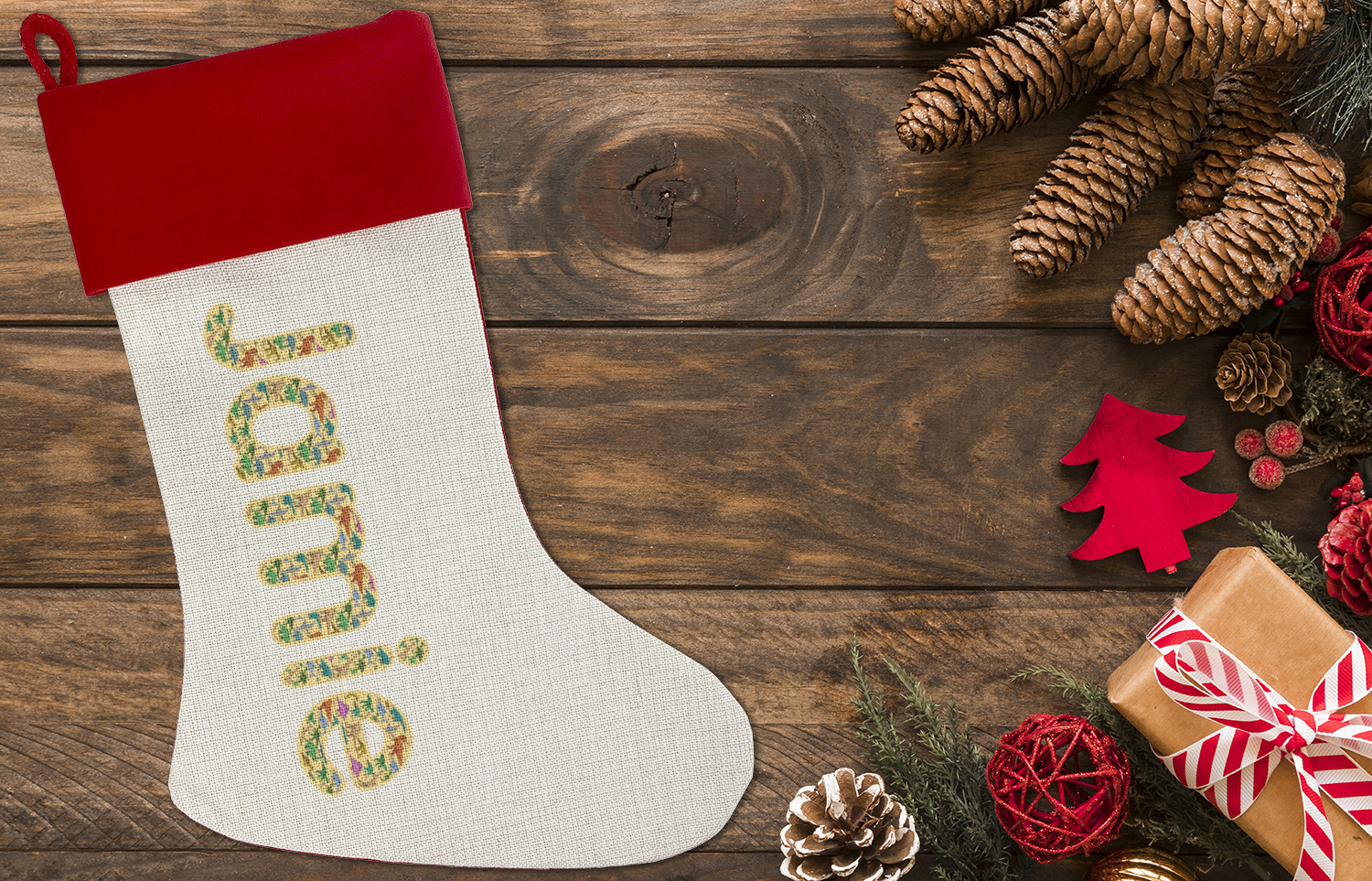 Our classic red stockings are made from a soft, yet durable polyester material perfect for any stocking stuffer! The front of our Christmas stockings have a linen front that boldly displays your custom design accented with a lush red cuff resting all around the stocking. Each stocking is approximately 18x12 with a durable cotton rope loop for hanging.