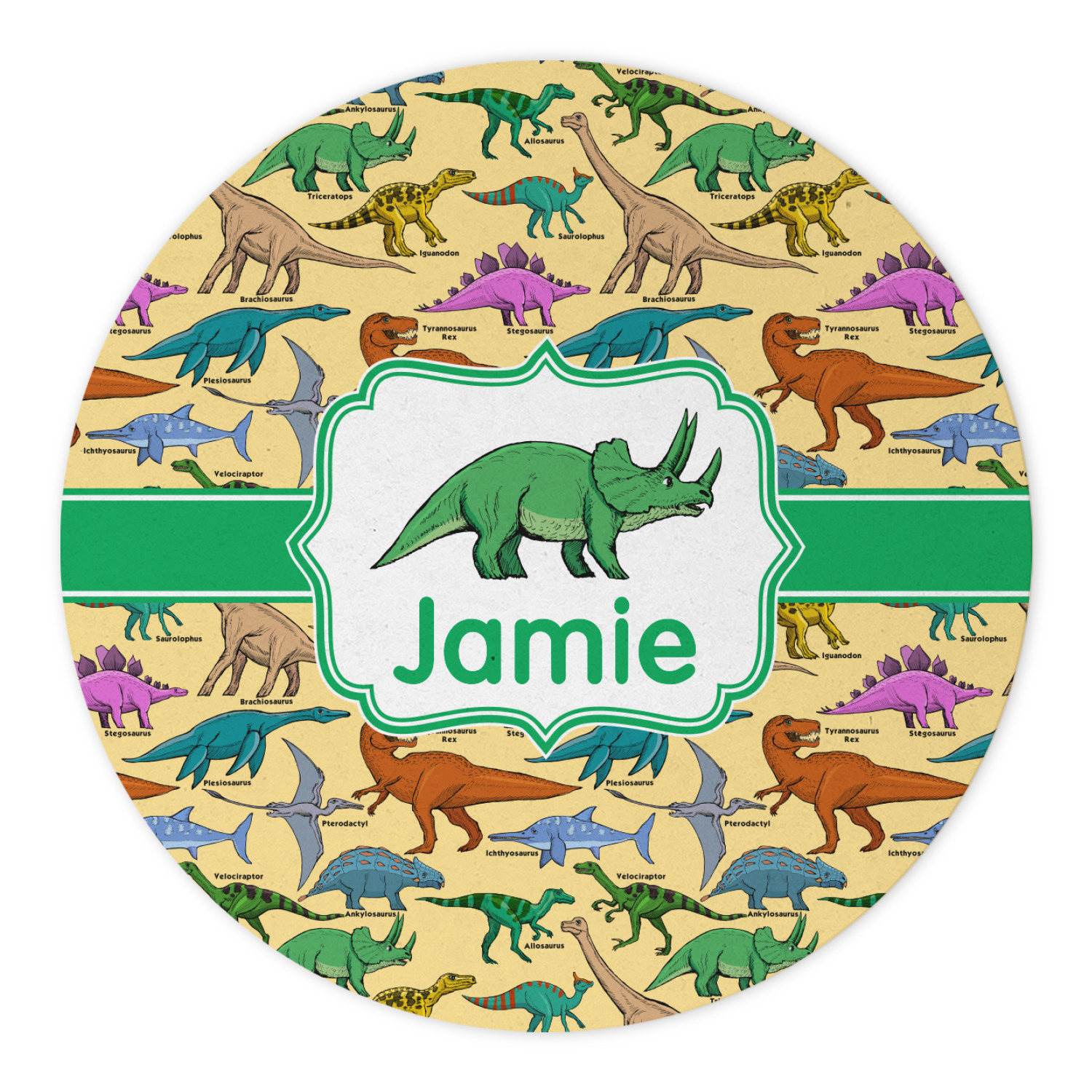 This is made up of 12 different hand drawn dinosaurs (Triceratops, Tyrannosaurus Rex, Velociraptor, Brachiosaurus, Ankylosaurus, Pterodactyl, Stegosaurus, Saurolophus, Plesiosaurus, Allosaurus, Iguanodon and Ichthyosaurus) and each dinosaur has it's type written next to it. We chose a light yellow background with a green ribbon and decorative label; and we chose to use a triceratops and a name inside the label.