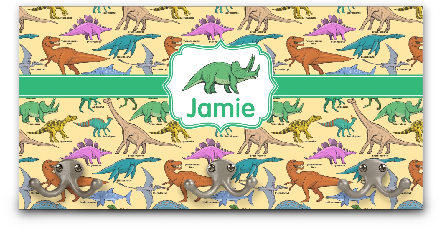 This coat rack is the perfect way to add some personality to your wall or entryway. The board is made of a strong maple that is approximately 16" x 8". The three 2-prong hooks are a sturdy metal that have three screws attaching them to the board. Your design is printed right onto the front of the board while the back and sides are a simple black.