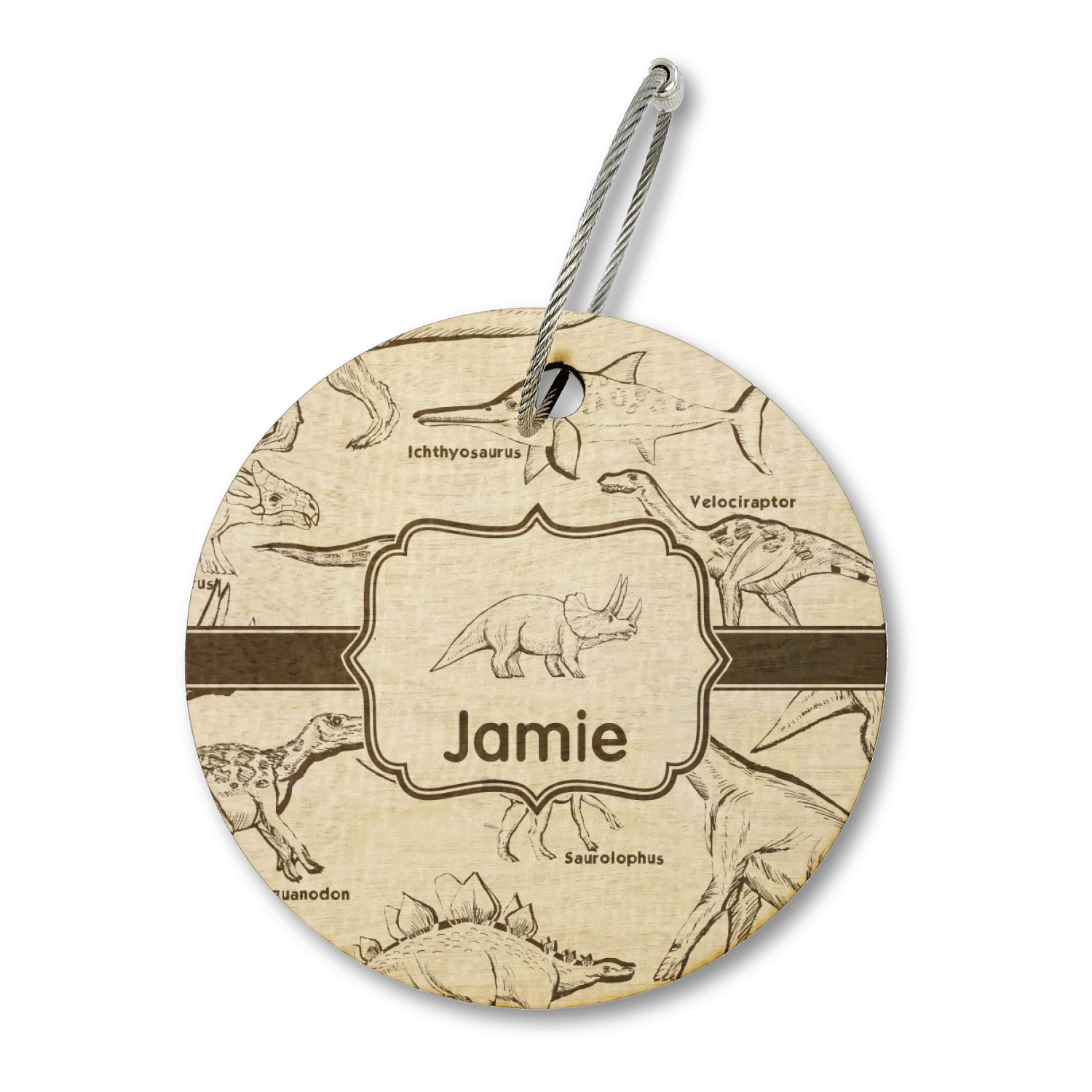 This is made up of 12 different hand drawn dinosaurs (Triceratops, Tyrannosaurus Rex, Velociraptor, Brachiosaurus, Ankylosaurus, Pterodactyl, Stegosaurus, Saurolophus, Plesiosaurus, Allosaurus, Iguanodon and Ichthyosaurus) and each dinosaur has it's type written next to it. We chose a light yellow background with a green ribbon and decorative label; and we chose to use a triceratops and a name inside the label.