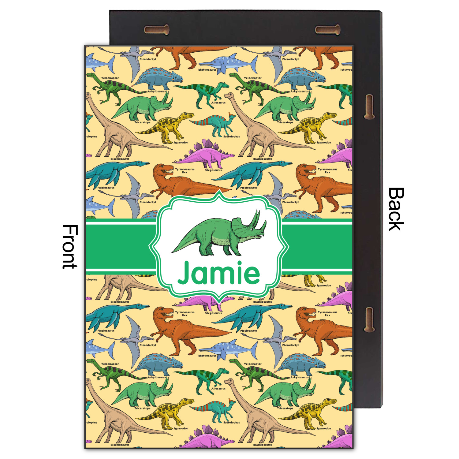 This is made up of 12 different hand drawn dinosaurs (Triceratops, Tyrannosaurus Rex, Velociraptor, Brachiosaurus, Ankylosaurus, Pterodactyl, Stegosaurus, Saurolophus, Plesiosaurus, Allosaurus, Iguanodon and Ichthyosaurus) and each dinosaur has it's type written next to it. We chose a light yellow background with a green ribbon and decorative label; and we chose to use a triceratops and a name inside the label.
