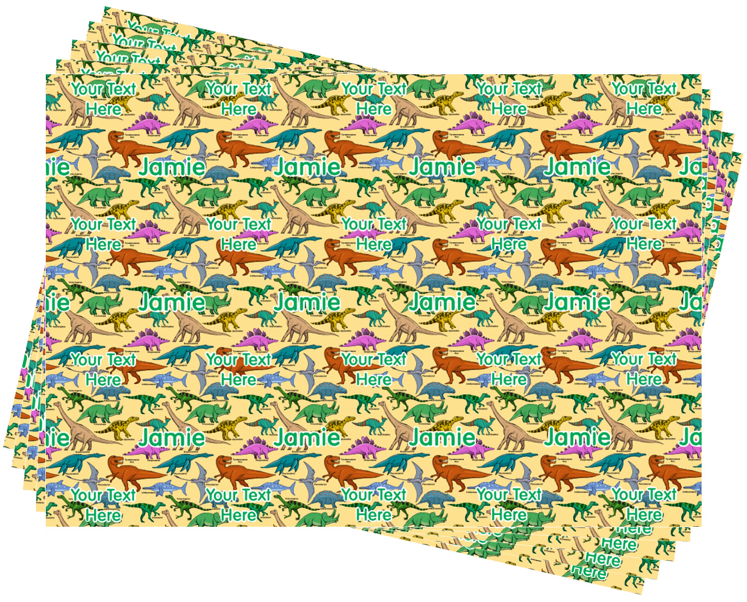 This is made up of 12 different hand drawn dinosaurs (Triceratops, Tyrannosaurus Rex, Velociraptor, Brachiosaurus, Ankylosaurus, Pterodactyl, Stegosaurus, Saurolophus, Plesiosaurus, Allosaurus, Iguanodon and Ichthyosaurus) and each dinosaur has it's type written next to it. We chose a light yellow background with a green ribbon and decorative label; and we chose to use a triceratops and a name inside the label.