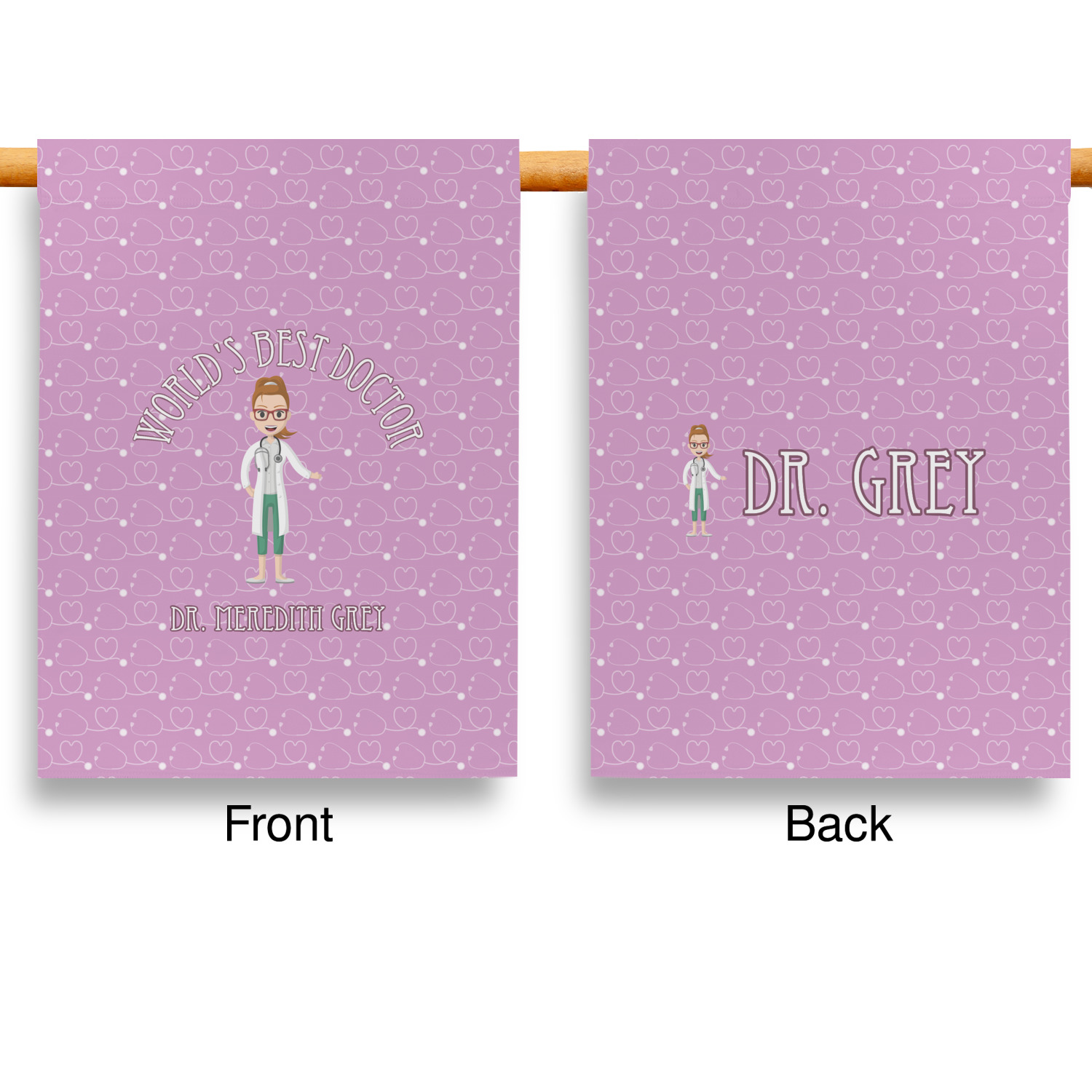 The design features an avatar doctor that is wearing a labcoat. You can easily change her hair color and skin tone. You can even swap her out for a male doctor! The background has a subtle pattern made out of stethescopes and is a fun purple. You personalization goes on top and below the avatar.