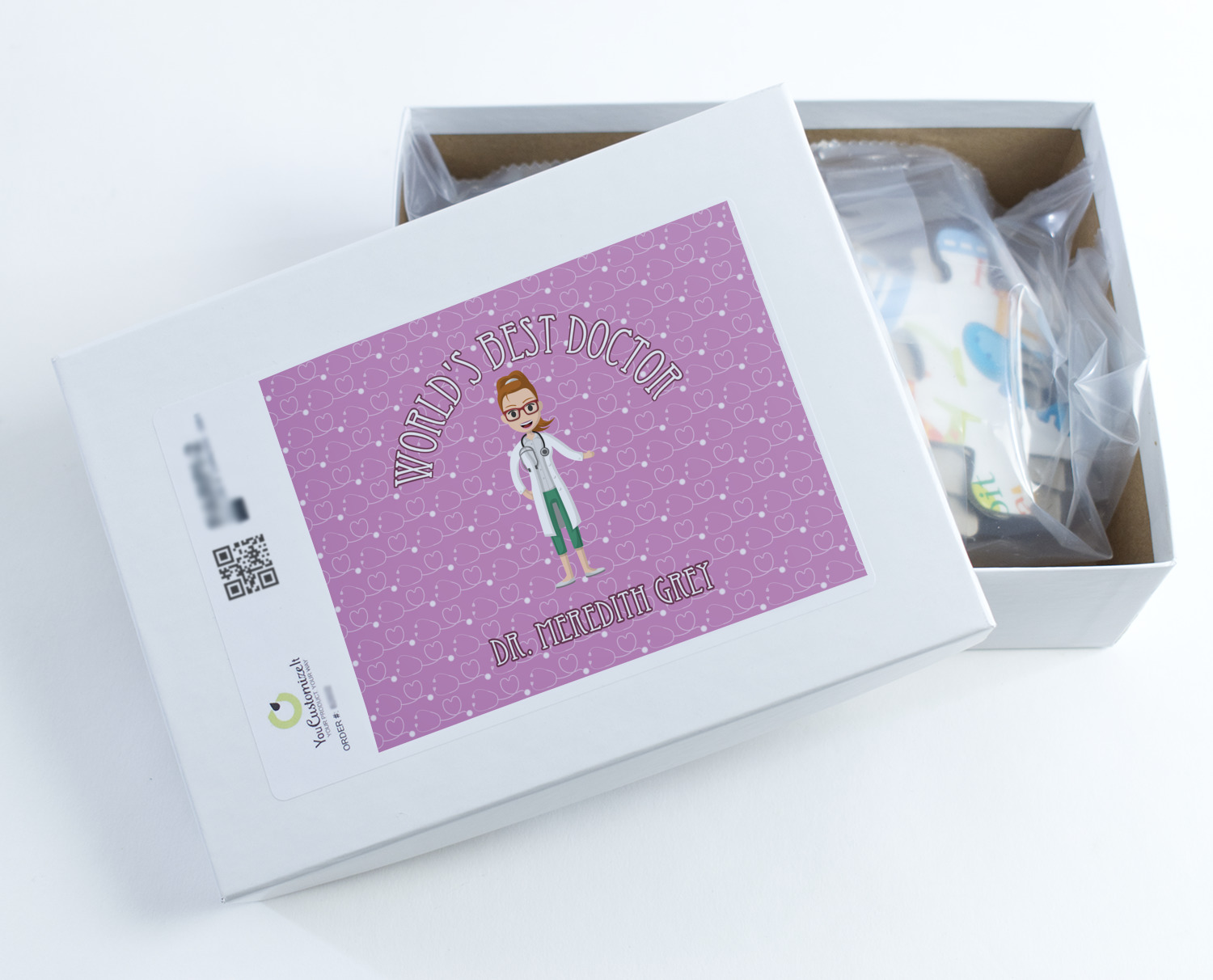 The design features an avatar doctor that is wearing a labcoat. You can easily change her hair color and skin tone. You can even swap her out for a male doctor! The background has a subtle pattern made out of stethescopes and is a fun purple. You personalization goes on top and below the avatar.