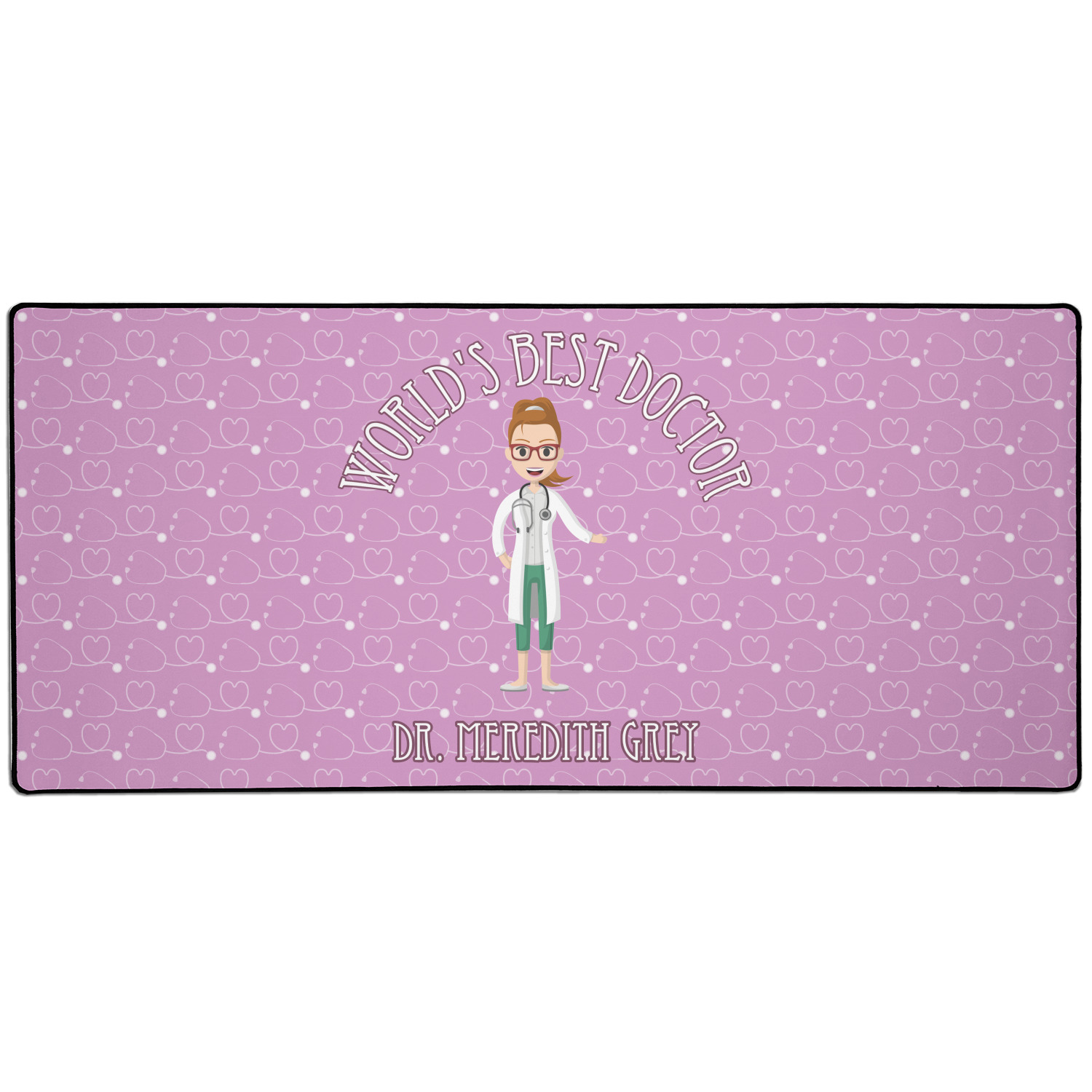 The design features an avatar doctor that is wearing a labcoat. You can easily change her hair color and skin tone. You can even swap her out for a male doctor! The background has a subtle pattern made out of stethescopes and is a fun purple. You personalization goes on top and below the avatar.
