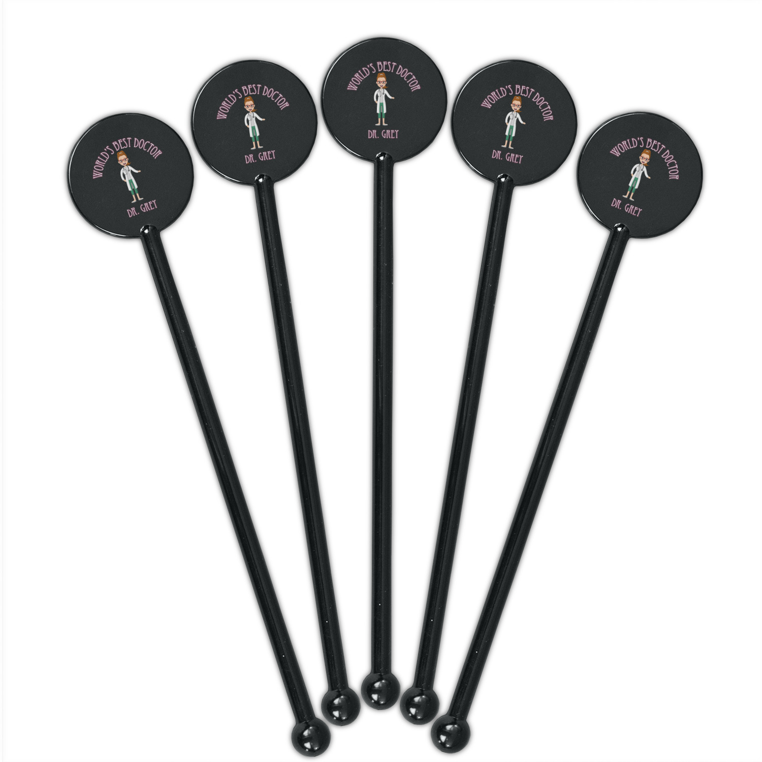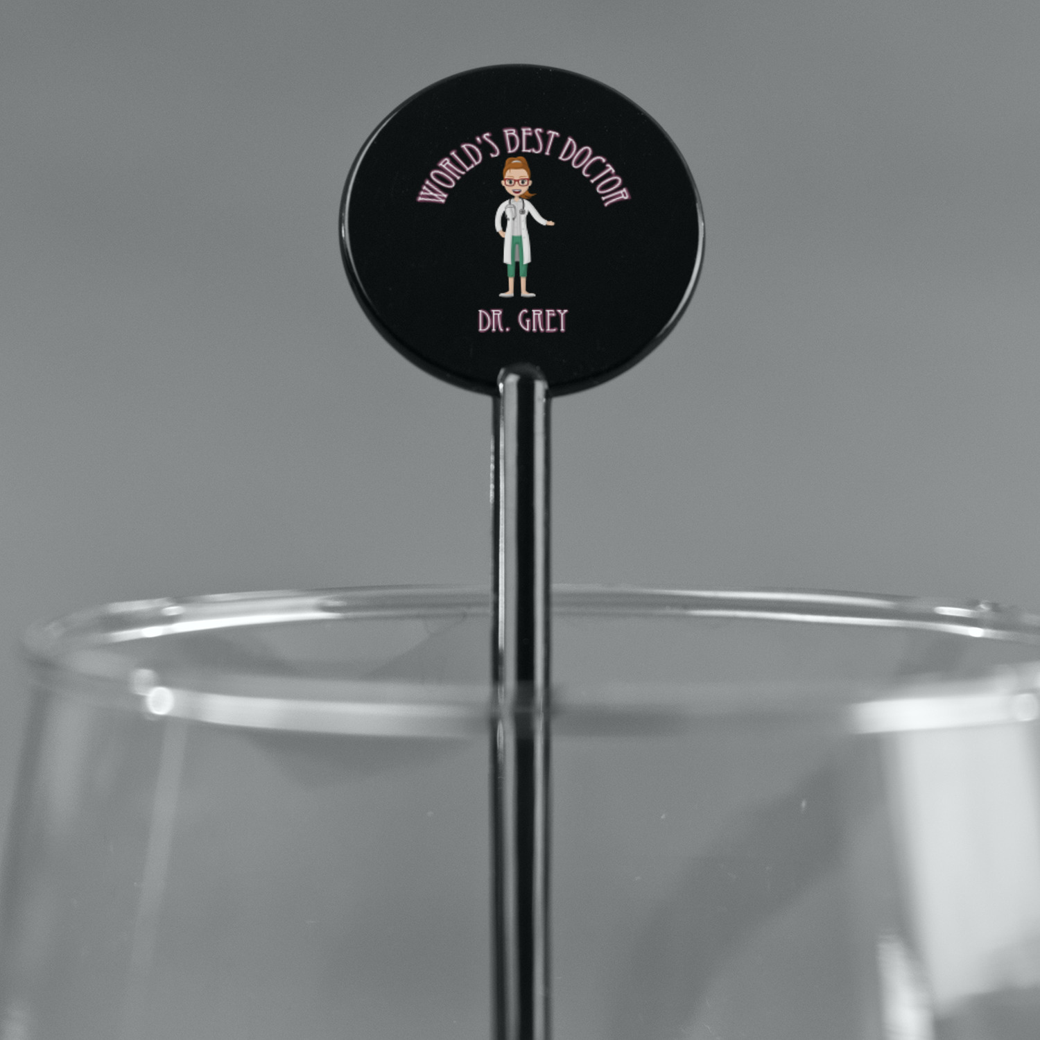 The design features an avatar doctor that is wearing a labcoat. You can easily change her hair color and skin tone. You can even swap her out for a male doctor! The background has a subtle pattern made out of stethescopes and is a fun purple. You personalization goes on top and below the avatar.