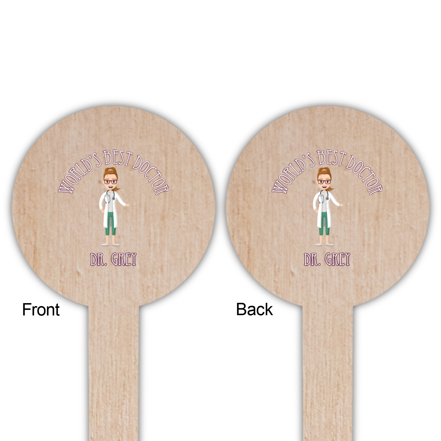 The design features an avatar doctor that is wearing a labcoat. You can easily change her hair color and skin tone. You can even swap her out for a male doctor! The background has a subtle pattern made out of stethescopes and is a fun purple. You personalization goes on top and below the avatar.