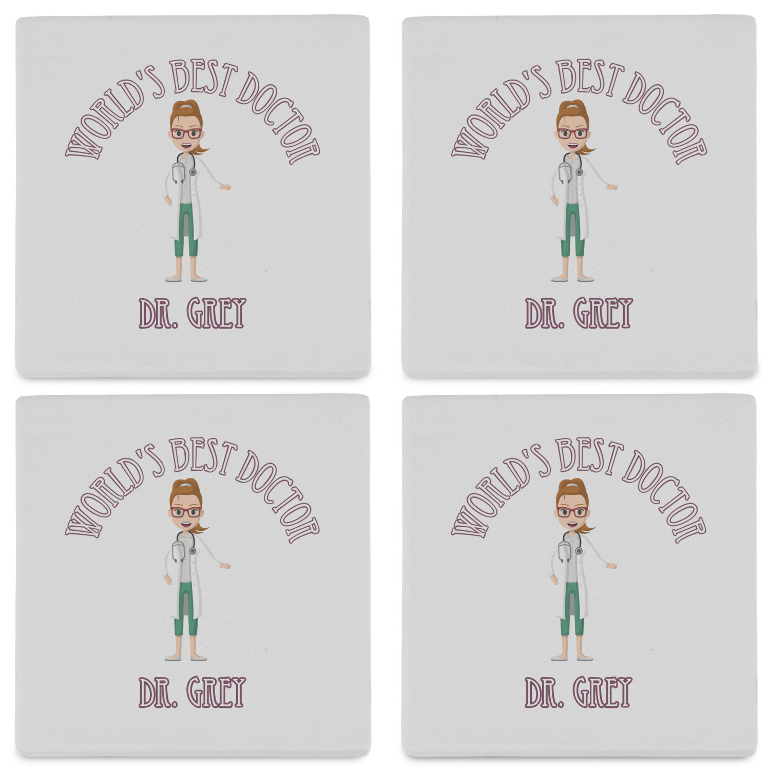 The design features an avatar doctor that is wearing a labcoat. You can easily change her hair color and skin tone. You can even swap her out for a male doctor! The background has a subtle pattern made out of stethescopes and is a fun purple. You personalization goes on top and below the avatar.