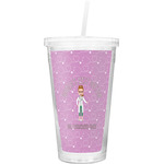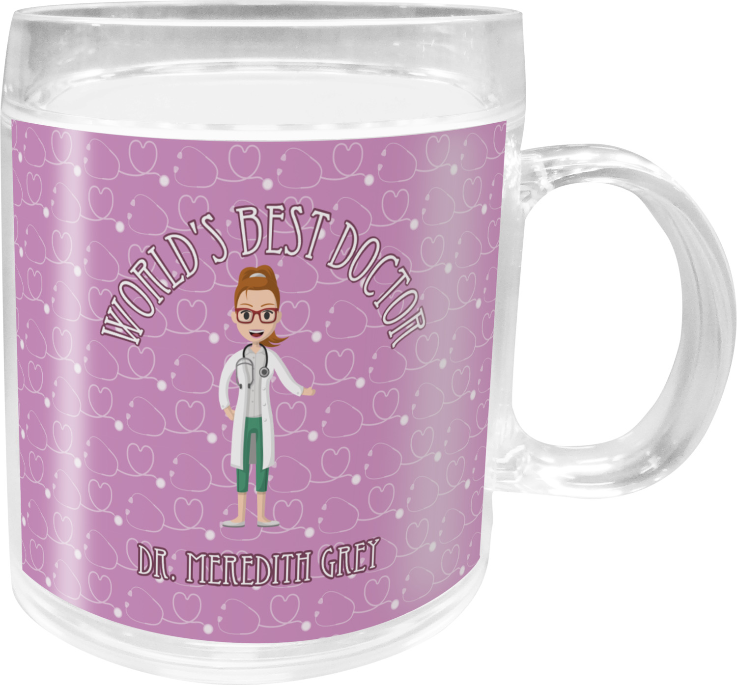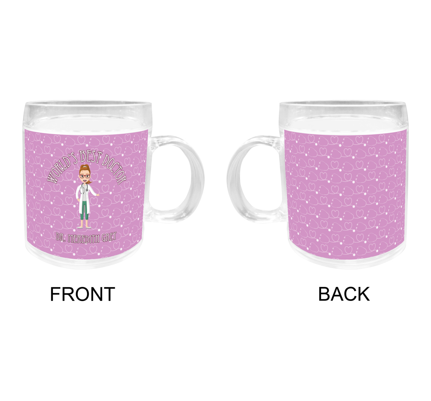 The design features an avatar doctor that is wearing a labcoat. You can easily change her hair color and skin tone. You can even swap her out for a male doctor! The background has a subtle pattern made out of stethescopes and is a fun purple. You personalization goes on top and below the avatar.
