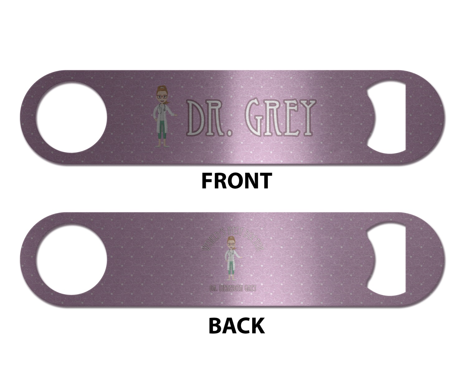 The design features an avatar doctor that is wearing a labcoat. You can easily change her hair color and skin tone. You can even swap her out for a male doctor! The background has a subtle pattern made out of stethescopes and is a fun purple. You personalization goes on top and below the avatar.
