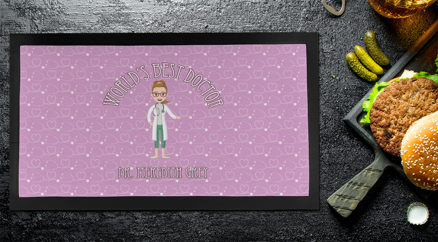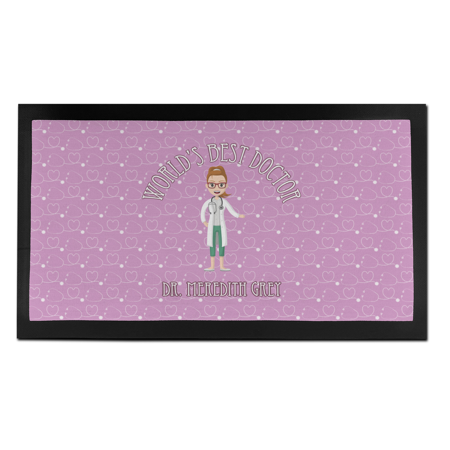 The design features an avatar doctor that is wearing a labcoat. You can easily change her hair color and skin tone. You can even swap her out for a male doctor! The background has a subtle pattern made out of stethescopes and is a fun purple. You personalization goes on top and below the avatar.