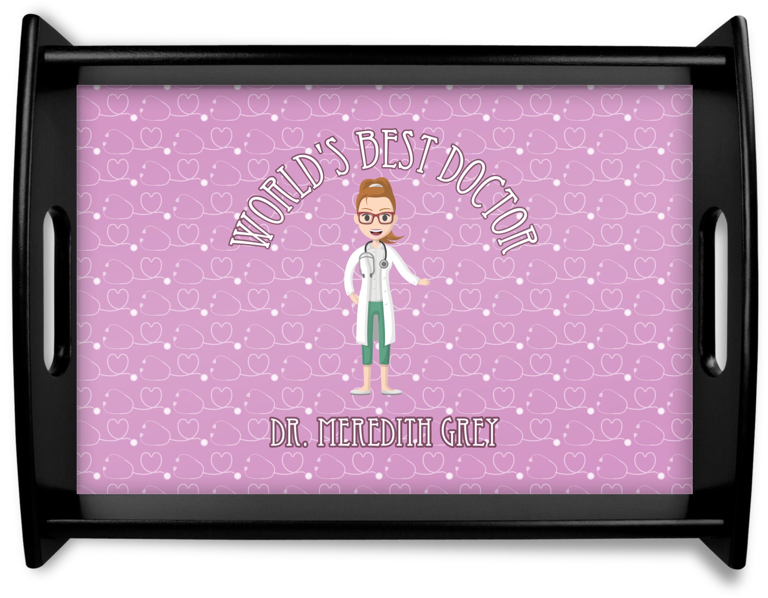 This serving tray with handles features square edges and two rounded sides, creating a very modern look. Each side is fabricated from a beautifully cut, natural wood. The bottom of the interior of the tray displays your customized design in bright, vibrant color. The tray is sold in both a black color and a natural wood look. Each variation of the wood serving tray has two sizes: Small, which is 14" x 10" x 2.25", and Large, which is 19.5" x 13.5" x 2.75".
