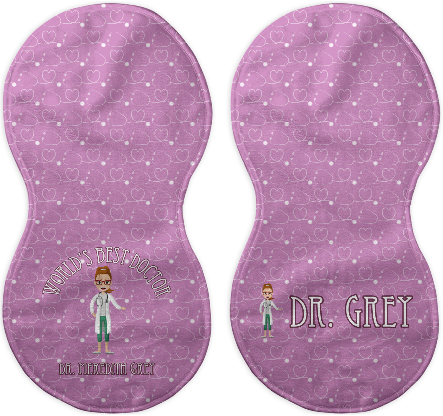 The design features an avatar doctor that is wearing a labcoat. You can easily change her hair color and skin tone. You can even swap her out for a male doctor! The background has a subtle pattern made out of stethescopes and is a fun purple. You personalization goes on top and below the avatar.