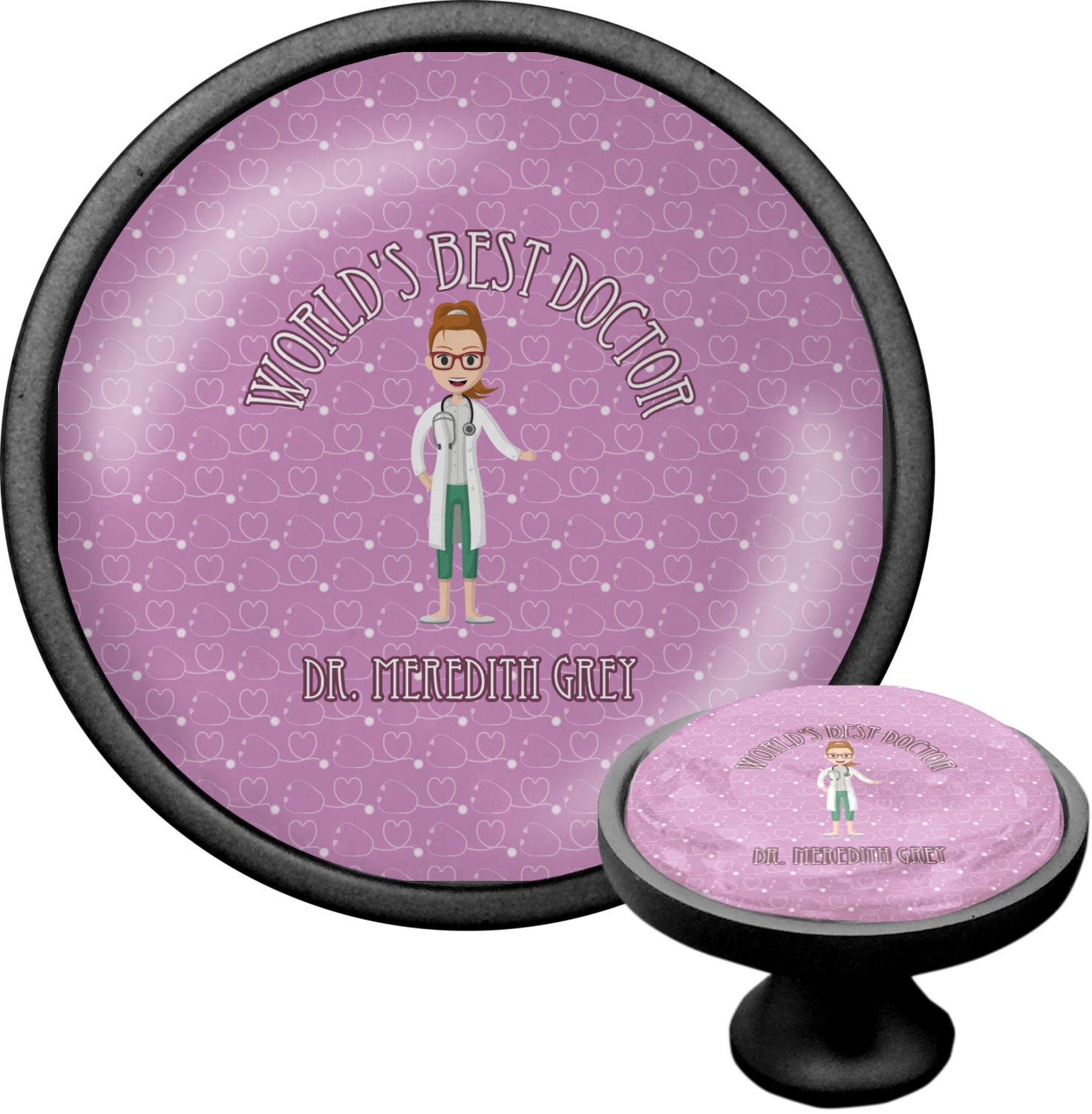 The design features an avatar doctor that is wearing a labcoat. You can easily change her hair color and skin tone. You can even swap her out for a male doctor! The background has a subtle pattern made out of stethescopes and is a fun purple. You personalization goes on top and below the avatar.