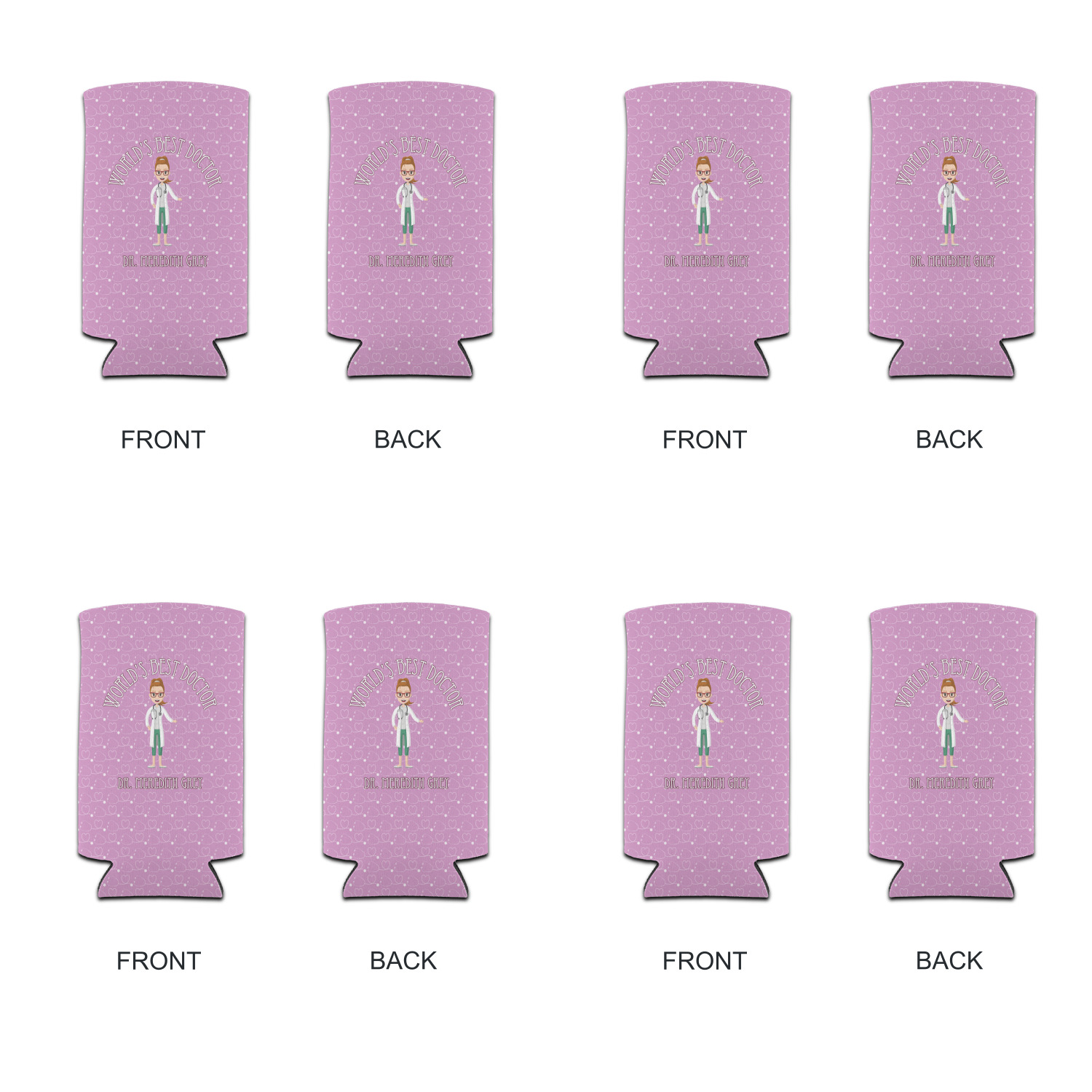 The design features an avatar doctor that is wearing a labcoat. You can easily change her hair color and skin tone. You can even swap her out for a male doctor! The background has a subtle pattern made out of stethescopes and is a fun purple. You personalization goes on top and below the avatar.