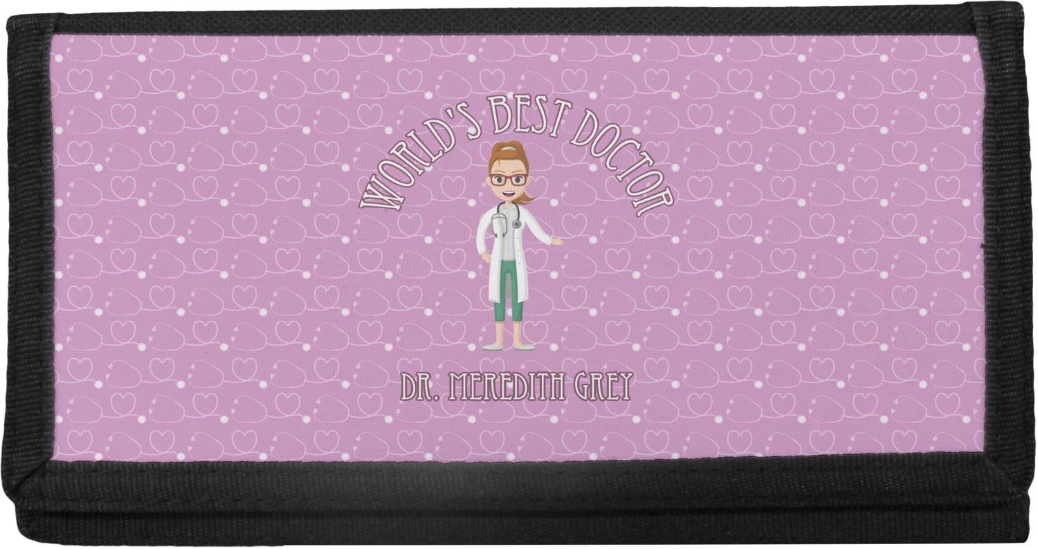 The design features an avatar doctor that is wearing a labcoat. You can easily change her hair color and skin tone. You can even swap her out for a male doctor! The background has a subtle pattern made out of stethescopes and is a fun purple. You personalization goes on top and below the avatar.