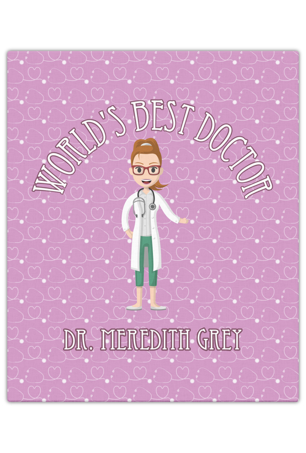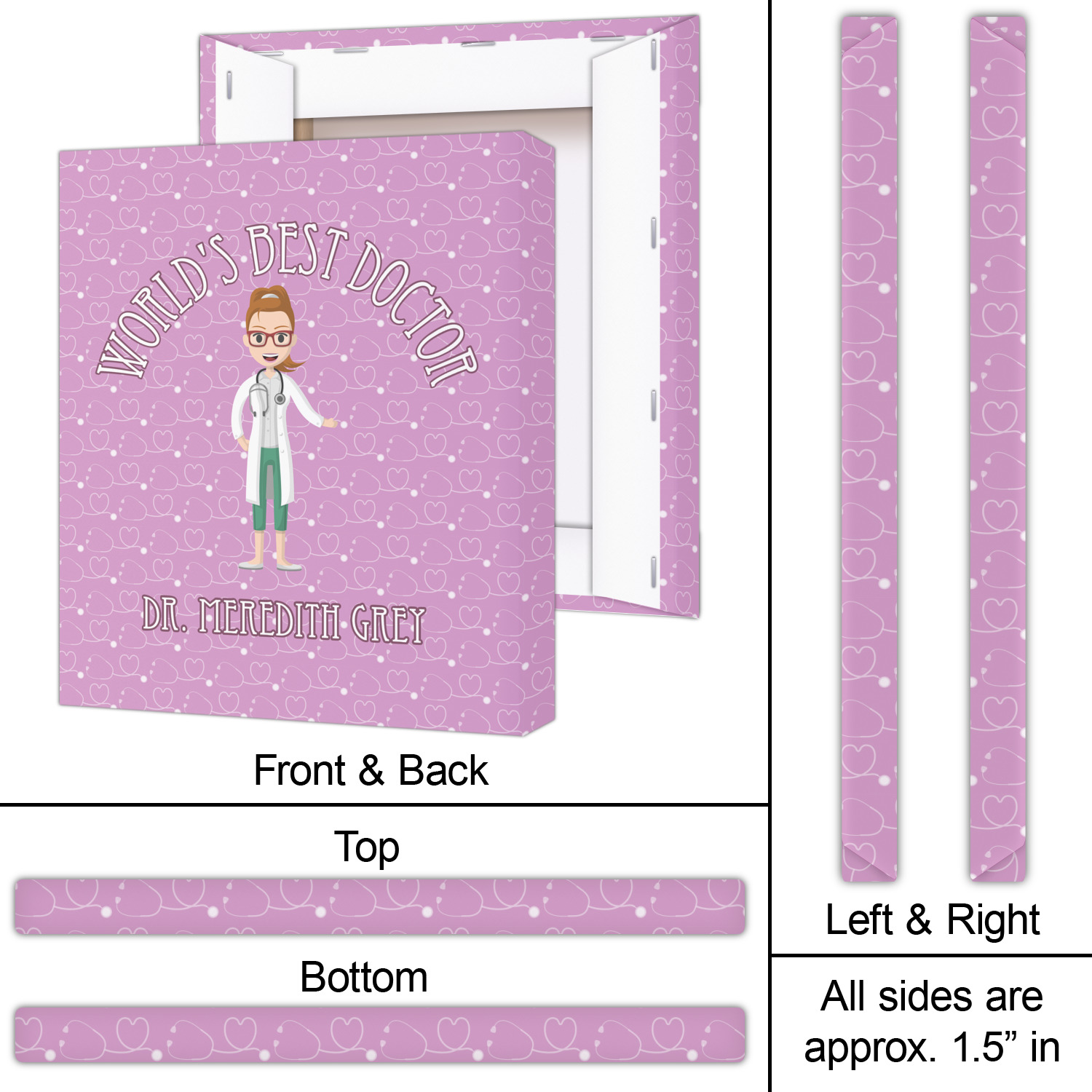 The design features an avatar doctor that is wearing a labcoat. You can easily change her hair color and skin tone. You can even swap her out for a male doctor! The background has a subtle pattern made out of stethescopes and is a fun purple. You personalization goes on top and below the avatar.