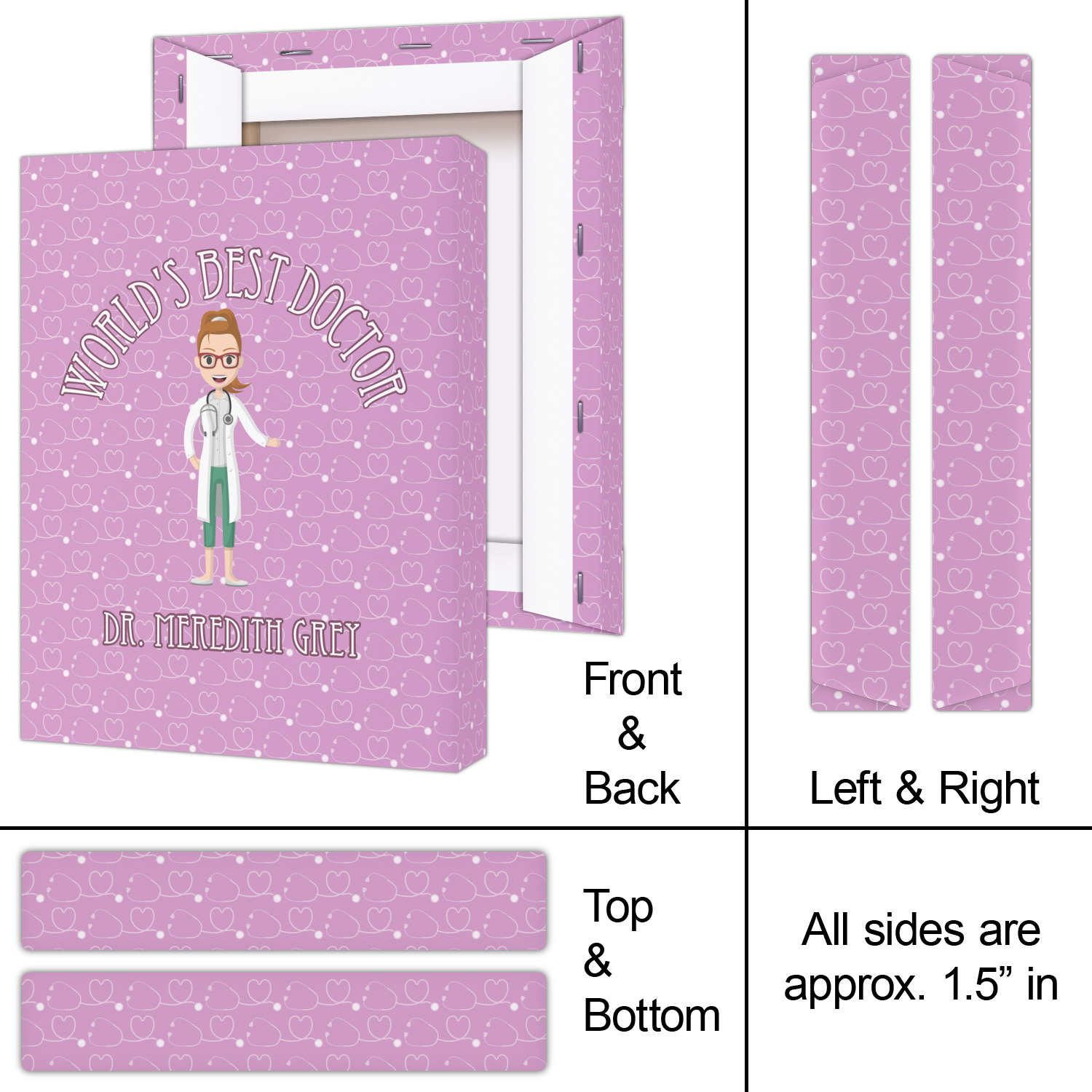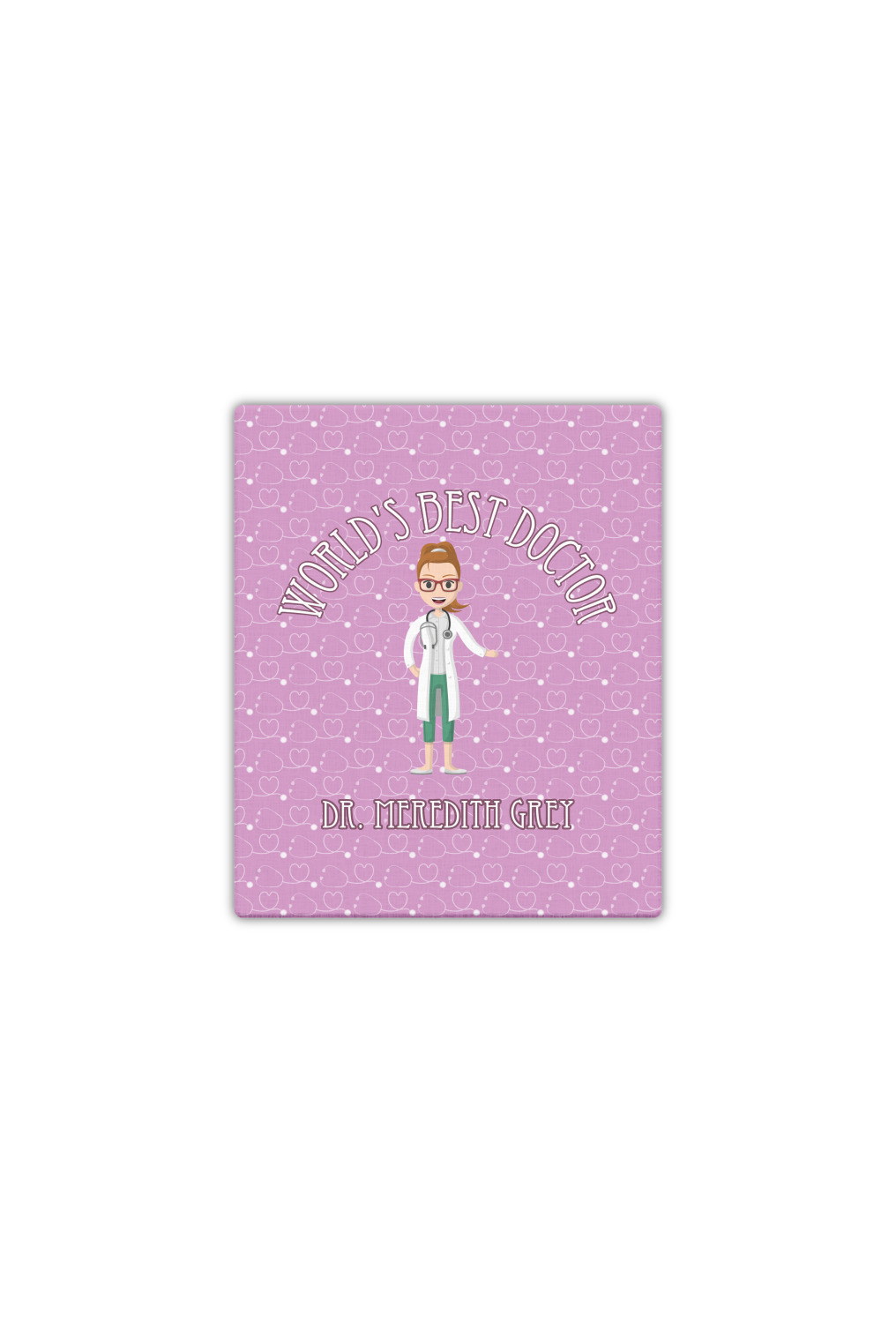 The design features an avatar doctor that is wearing a labcoat. You can easily change her hair color and skin tone. You can even swap her out for a male doctor! The background has a subtle pattern made out of stethescopes and is a fun purple. You personalization goes on top and below the avatar.