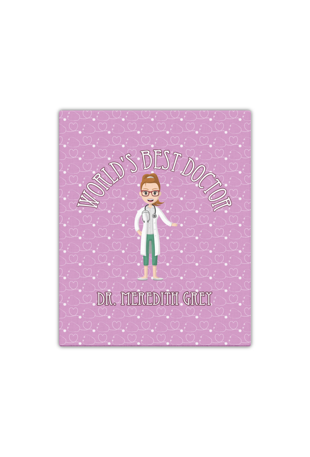 The design features an avatar doctor that is wearing a labcoat. You can easily change her hair color and skin tone. You can even swap her out for a male doctor! The background has a subtle pattern made out of stethescopes and is a fun purple. You personalization goes on top and below the avatar.