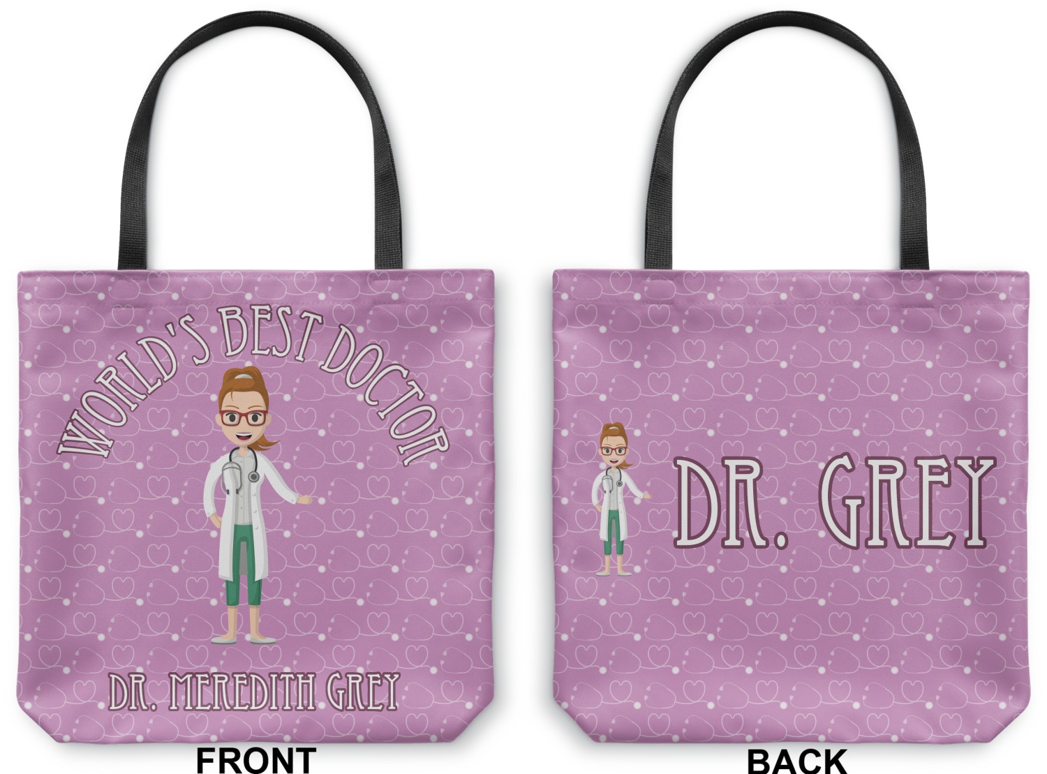The design features an avatar doctor that is wearing a labcoat. You can easily change her hair color and skin tone. You can even swap her out for a male doctor! The background has a subtle pattern made out of stethescopes and is a fun purple. You personalization goes on top and below the avatar.
