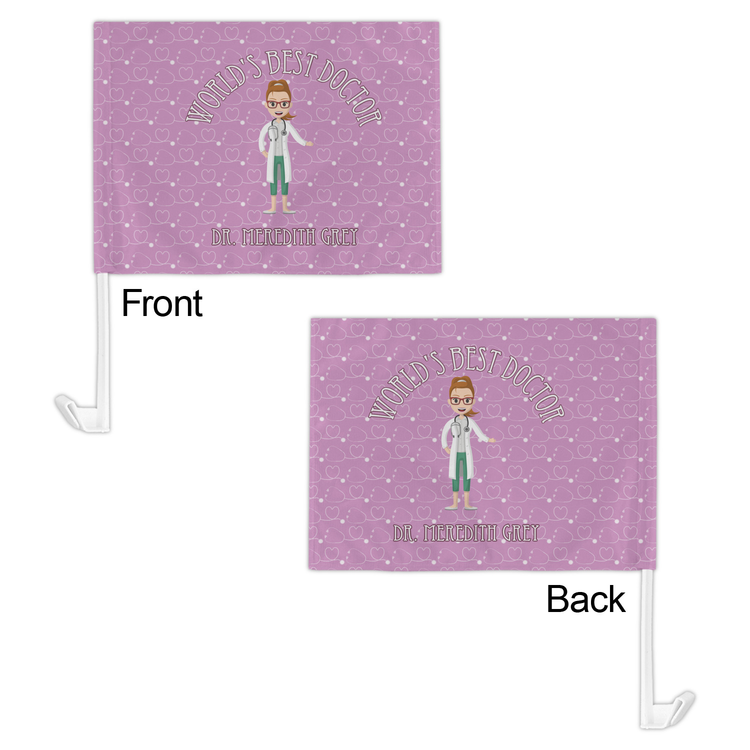 The design features an avatar doctor that is wearing a labcoat. You can easily change her hair color and skin tone. You can even swap her out for a male doctor! The background has a subtle pattern made out of stethescopes and is a fun purple. You personalization goes on top and below the avatar.