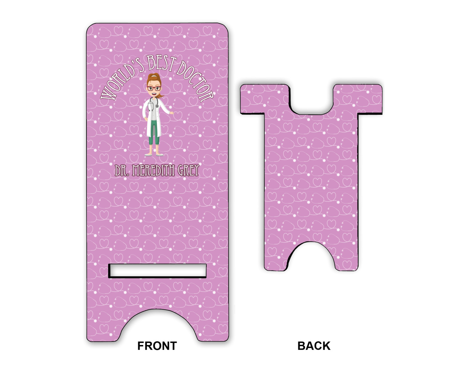 The design features an avatar doctor that is wearing a labcoat. You can easily change her hair color and skin tone. You can even swap her out for a male doctor! The background has a subtle pattern made out of stethescopes and is a fun purple. You personalization goes on top and below the avatar.