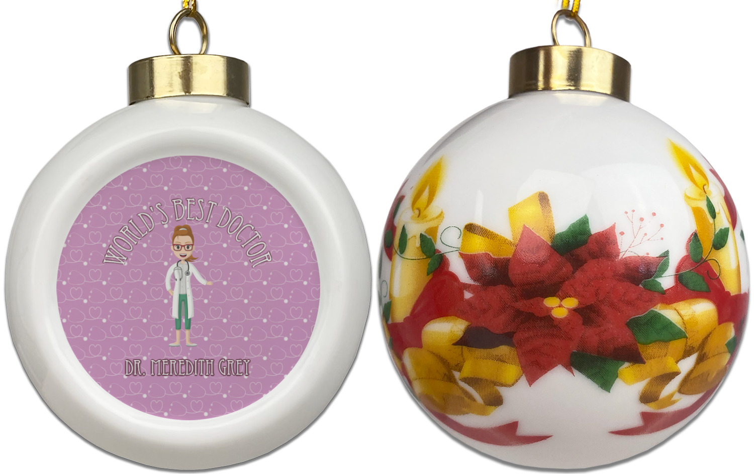 Our Christmas ornaments are a unique ceramic ball shape with a twist as it has a flat face to display your custom design! Select from one of our two design types - Christmas Tree or Poinsettia Garland - to adorn the curved back of your personal design. Each ornament measures 3H x 2.5W x 2D accompanied with a gold string accent for finishing touches to hang on your beautiful Christmas tree!